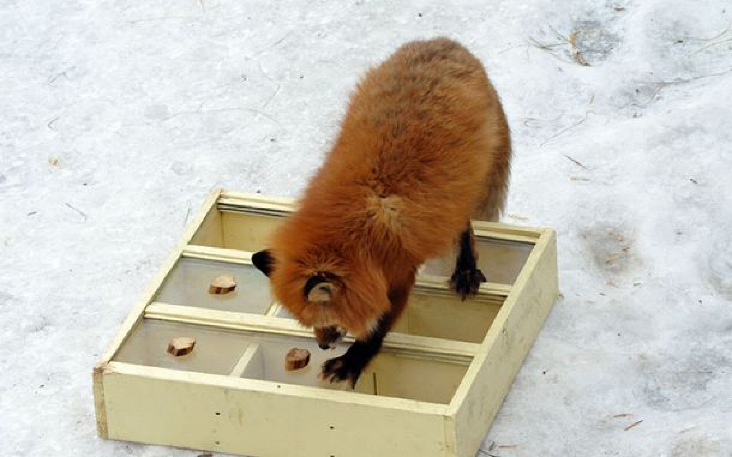 Она должна развлечь животных и не дать им съесть весь корм сразу. Приспособление устроено по принципу игры в пятнашки: коробка поделена на секторы, закрытые прозрачными крышками, которые ездят по пазам. В некоторые секторы кладется корм, чтобы добраться до него, лисам нужно сдвигать крышечки в определенном направлении. У головоломки есть разные уровни сложности. Например, в одном нужно отодвинуть только одну крышку, а в другом — сразу несколько крышек в определенной последовательности.