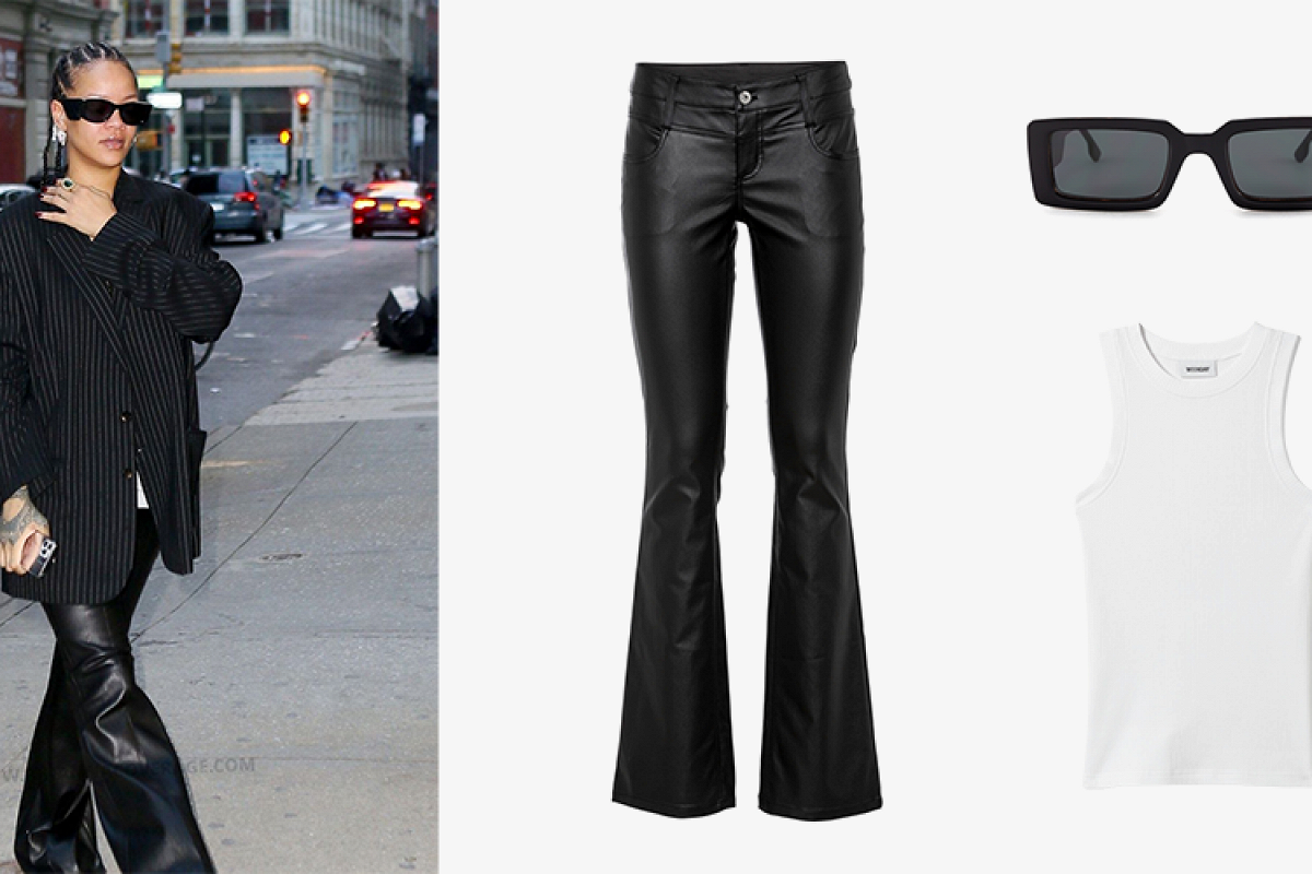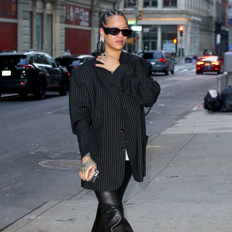Одеться как Рианна: полосатый объемный жакет и кожаные брюки клеш