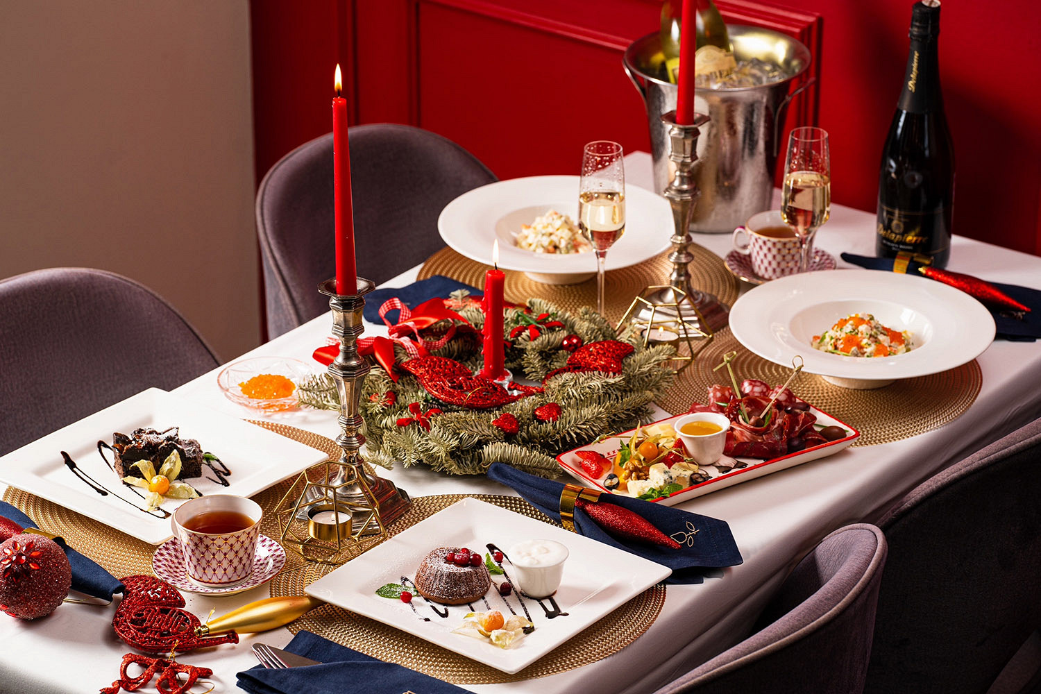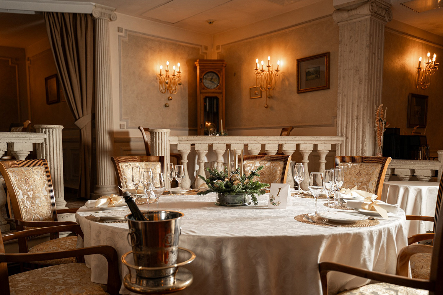 Встреча Нового года за спокойным ужином в теплой атмосфере старинного особняка с камином. Шеф-повар представит авторское сет-меню, созданное под вдохновением от зимнего Петербурга. Ноту тихого семейного волшебства добавит поздравление от Деда Мороза.