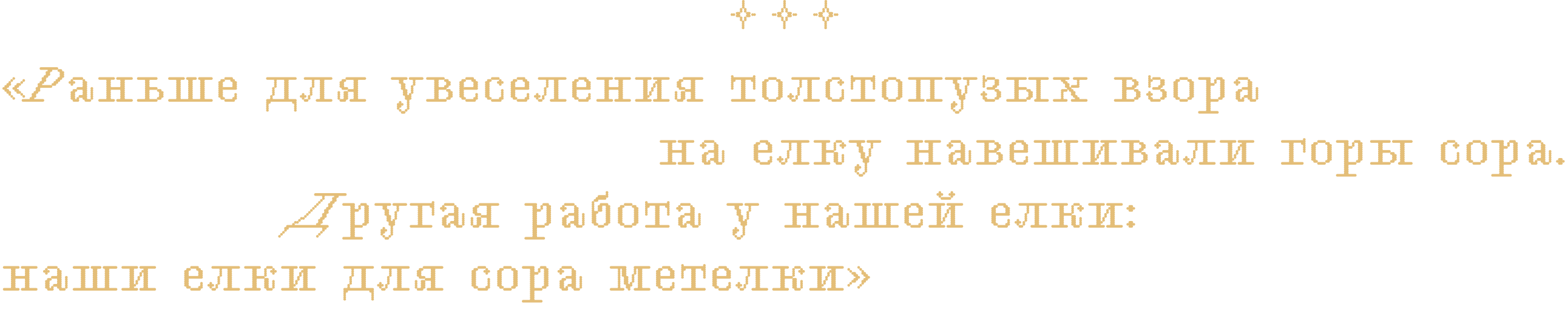 Традиция эта пережила многие десятилетия. В 1841 году в рассказе «Аптекарша» Владимир Соллогуб писал: «Налево красуется кабак с заветною елкой...» А в повести «Антон-Горемыка» Дмитрия Григоровича один из персонажей «успел уже ни свет ни заря заглянуть под елку и был сильно навеселе». Стоит ли говорить, что под деревом он искал совсем не подарки: так говорили о человеке, заскочившем в кабак перехватить чарку-другую.