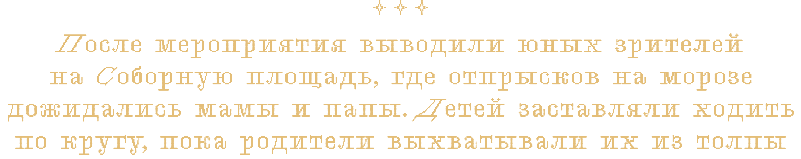 Общественные елки стали важным элементом праздника: свой большой праздник проводили в каждой школе и детском саду, в заводских домах культуры, в городах и поселках. Впрочем, как часто бывало в Советском Союзе, за внешней демократичностью скрывалась иерархия: все знали, что есть просто елки, а есть главная, Кремлевская, проходившая в Кремлевском Дворце съездов, — попасть на нее было мечтой каждого ребенка. Эта елка символизировала единство и благополучие советского народа — столь желанное, сколь и недостижимое.