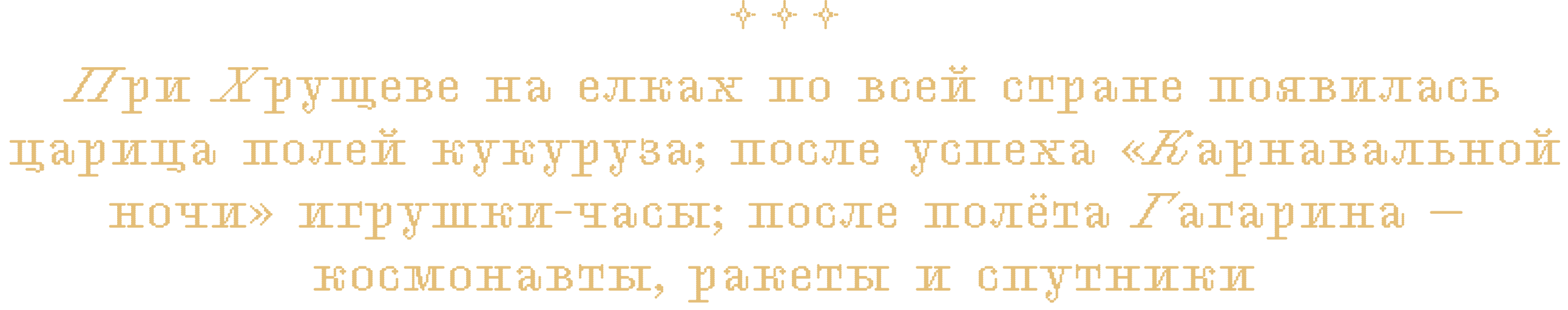 Новые времена требовали и новых, идеологически выдержанных игрушек. Вместо вифлеемской звезды навершие украсила рубиновая пятиконечная, как на кремлевских башнях, а на ветках ангелочков сменили красноармейцы, пионеры, парашютисты и дирижабли. Были даже шары с портретами Ленина и Сталина — хотя популярности они не снискали. В будущем мода на игрушки продолжала развиваться, отражая достижения советской науки и культуры.