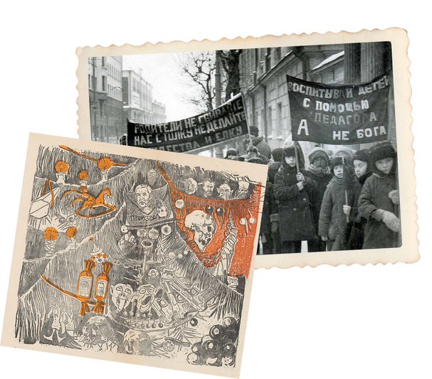 После октябрьского переворота 1917 года запрет сняли, но ненадолго. Буржуазный пережиток, да еще и крепко связанный с поповскими обычаями, — елка снова попала в опалу, теперь уже на десятилетия. Антирелигиозная агитация направилась и на этот невинный символ ушедшей эпохи. «Раньше для увеселения толстопузых взора/На елку навешивали горы сора./Другая работа у нашей елки:/Наши елки для сора метелки», — восклицал Владимир Маяковский в рождественском номере «Окон РОСТа» в 1920 году. Ему вторил Александр Введенский: «Только тот, кто друг попов, елку праздновать готов./Мы с тобой — враги попам. Рождества не надо нам».