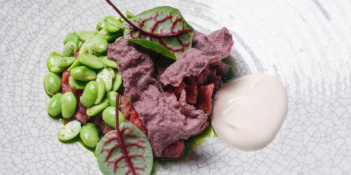 Тартар из говядины с картофельными чипсами и пеной из пармезана, 410 р.