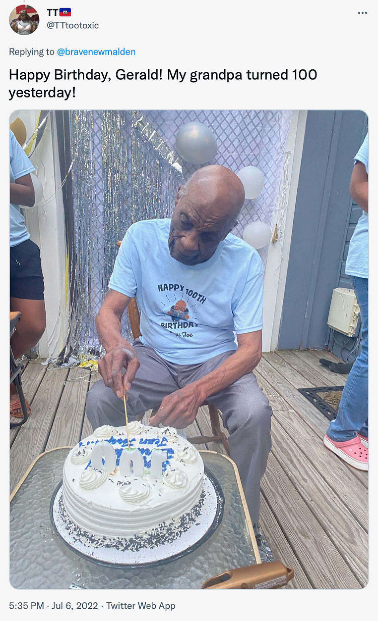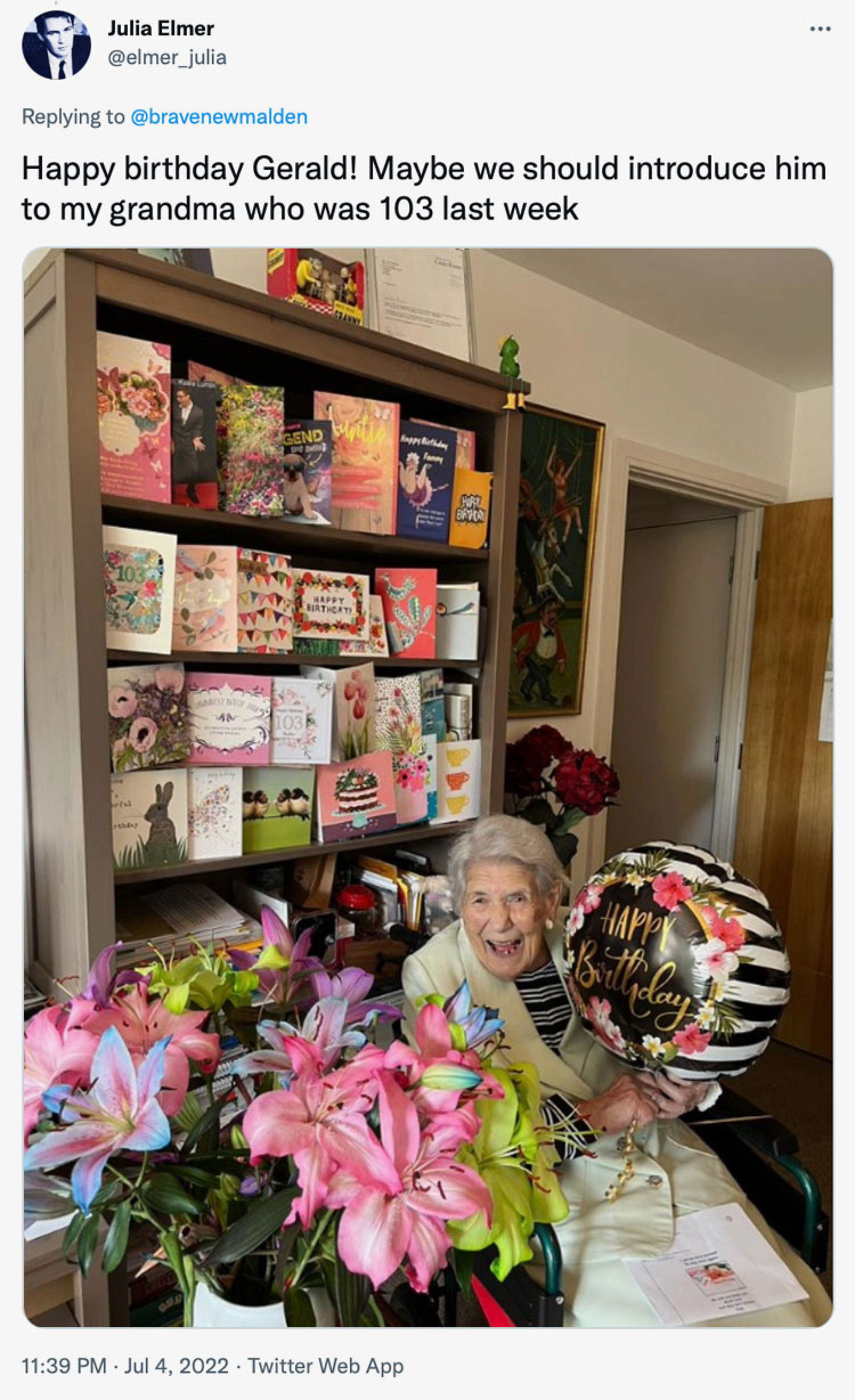 «С днем рождения, Джеральд! Моему дедушке вчера исполнилось 100 [лет]»