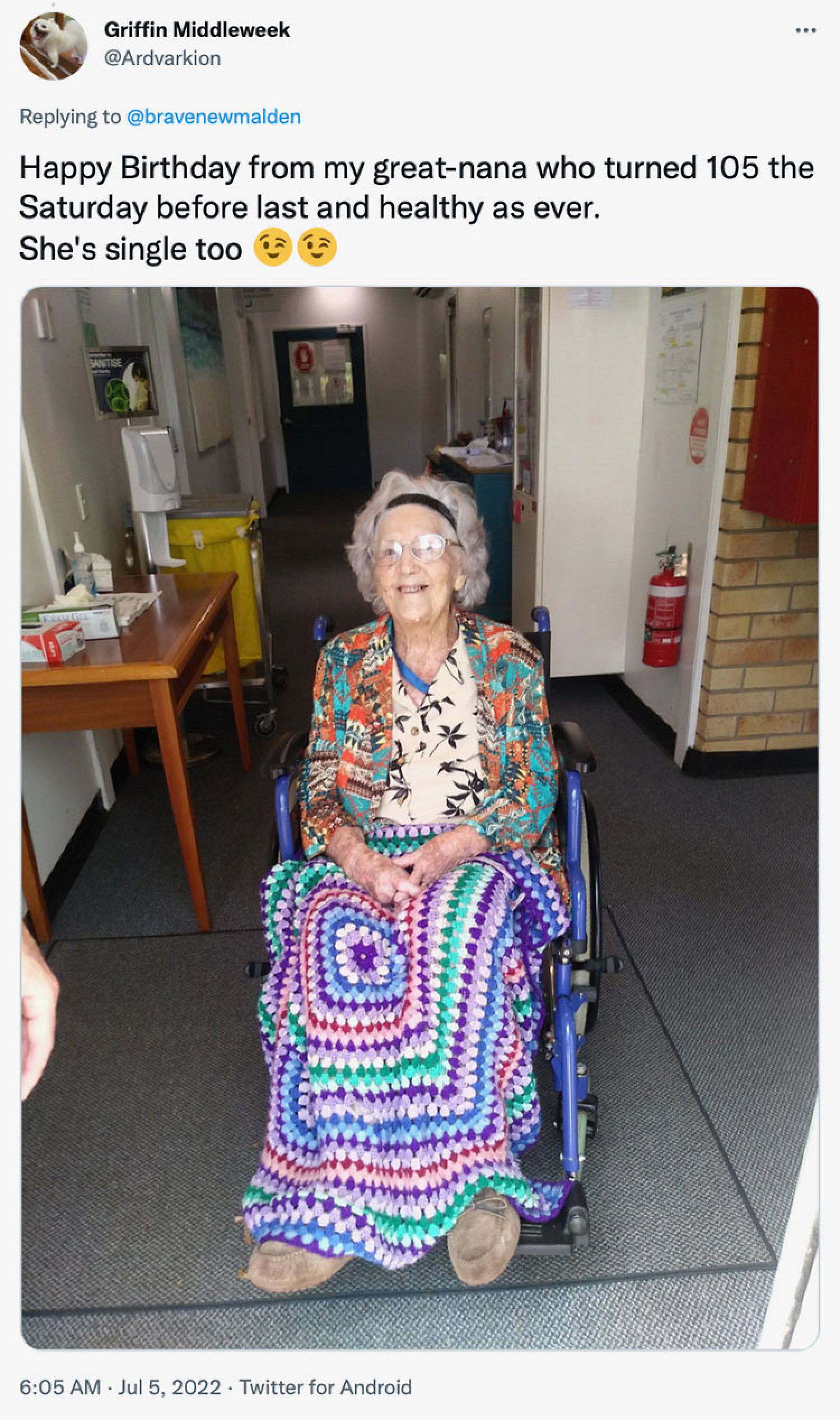 «Поздравления от моей прабабушки, которой в позапрошлую субботу исполнилось 105 лет, и она здоровее, чем когда‑либо. И она тоже одинока»