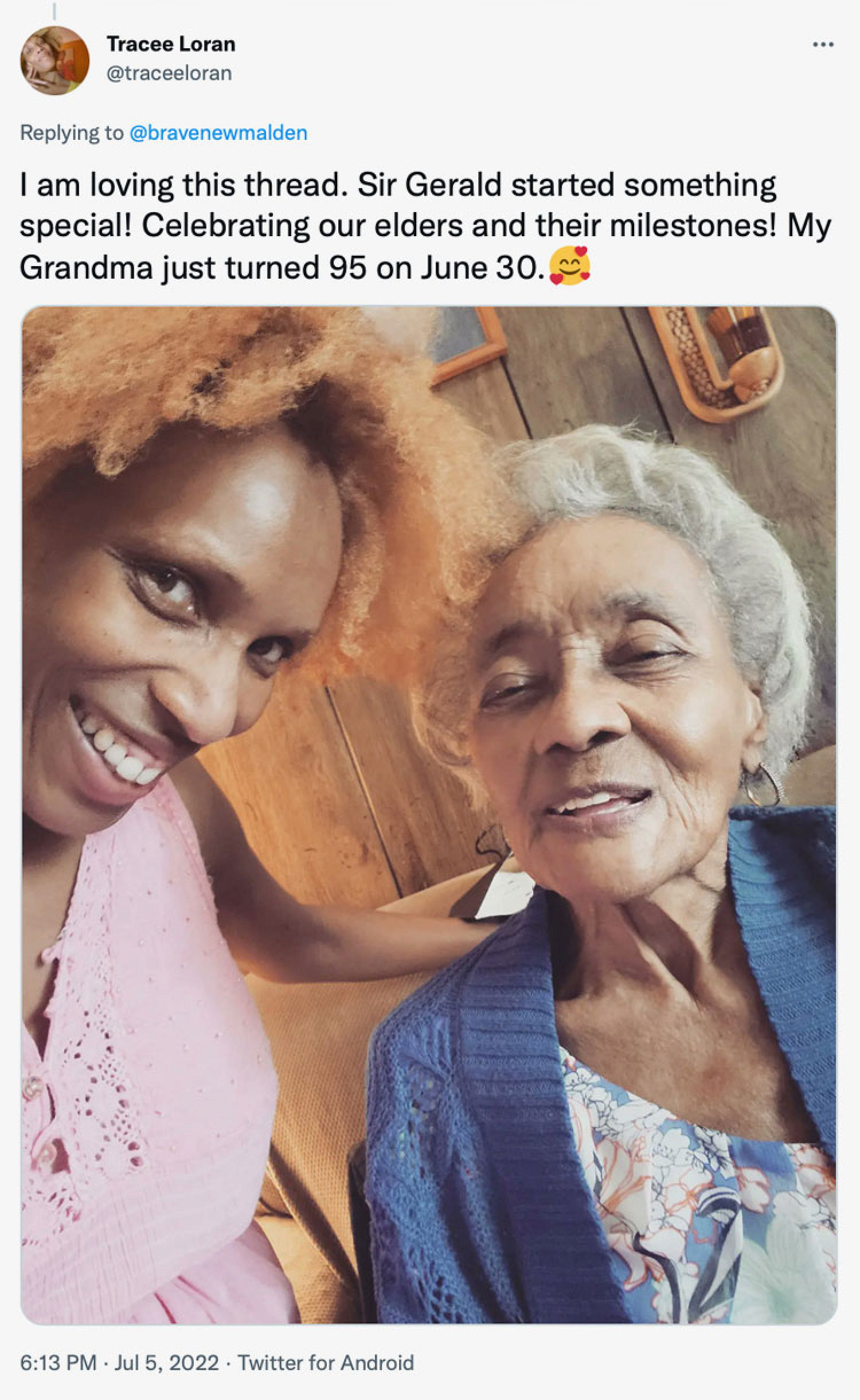 «Я люблю этот тред. Сэр Джеральд послужил причиной чего‑то особенного. Чествуем наших старших и их жизненные вехи! Моей бабушке 30 июня исполнилось 95 лет»