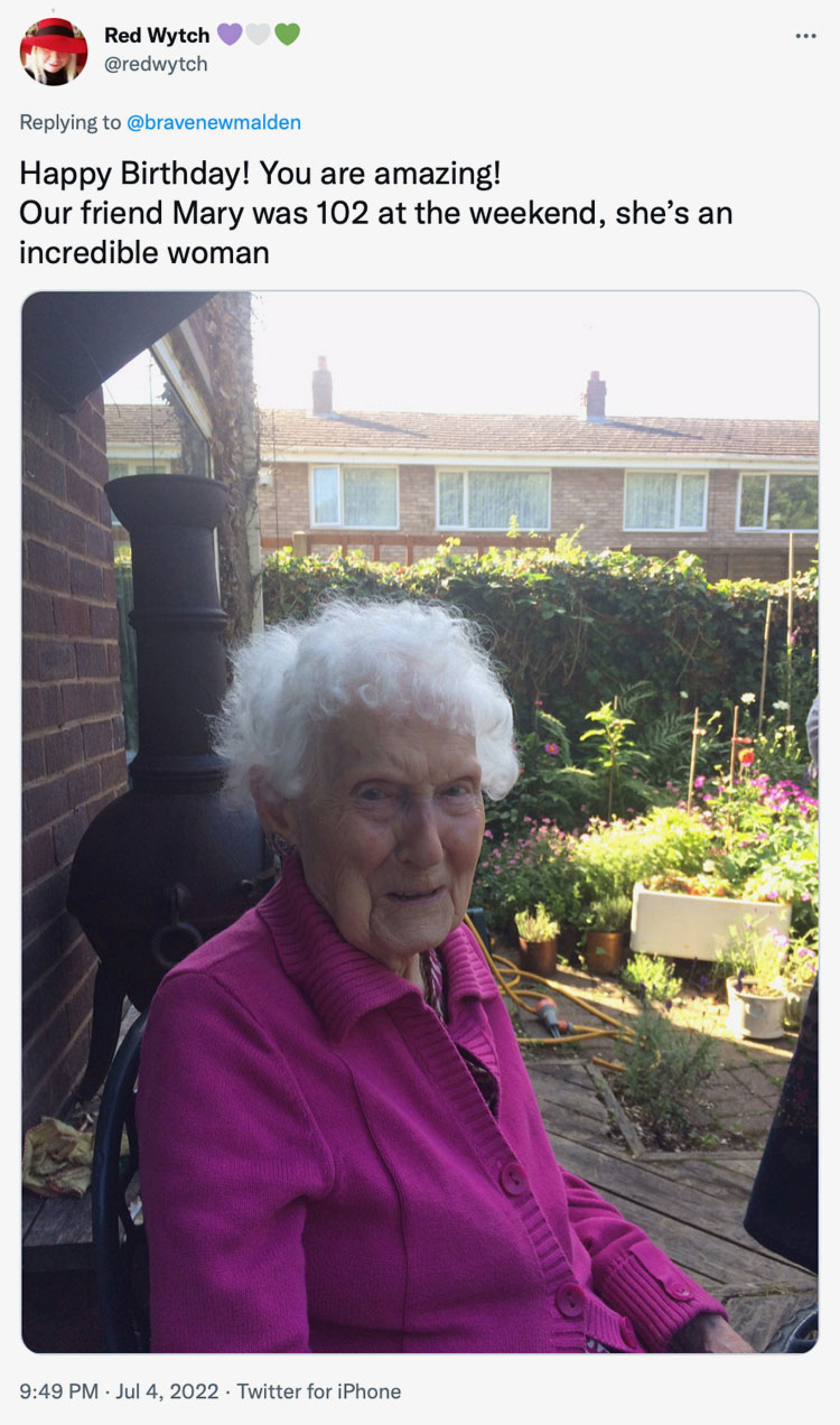 «С днем рождения! Вы великолепны! Нашей подруге Мэри на выходных исполнилось 102 года, она невероятная женщина»