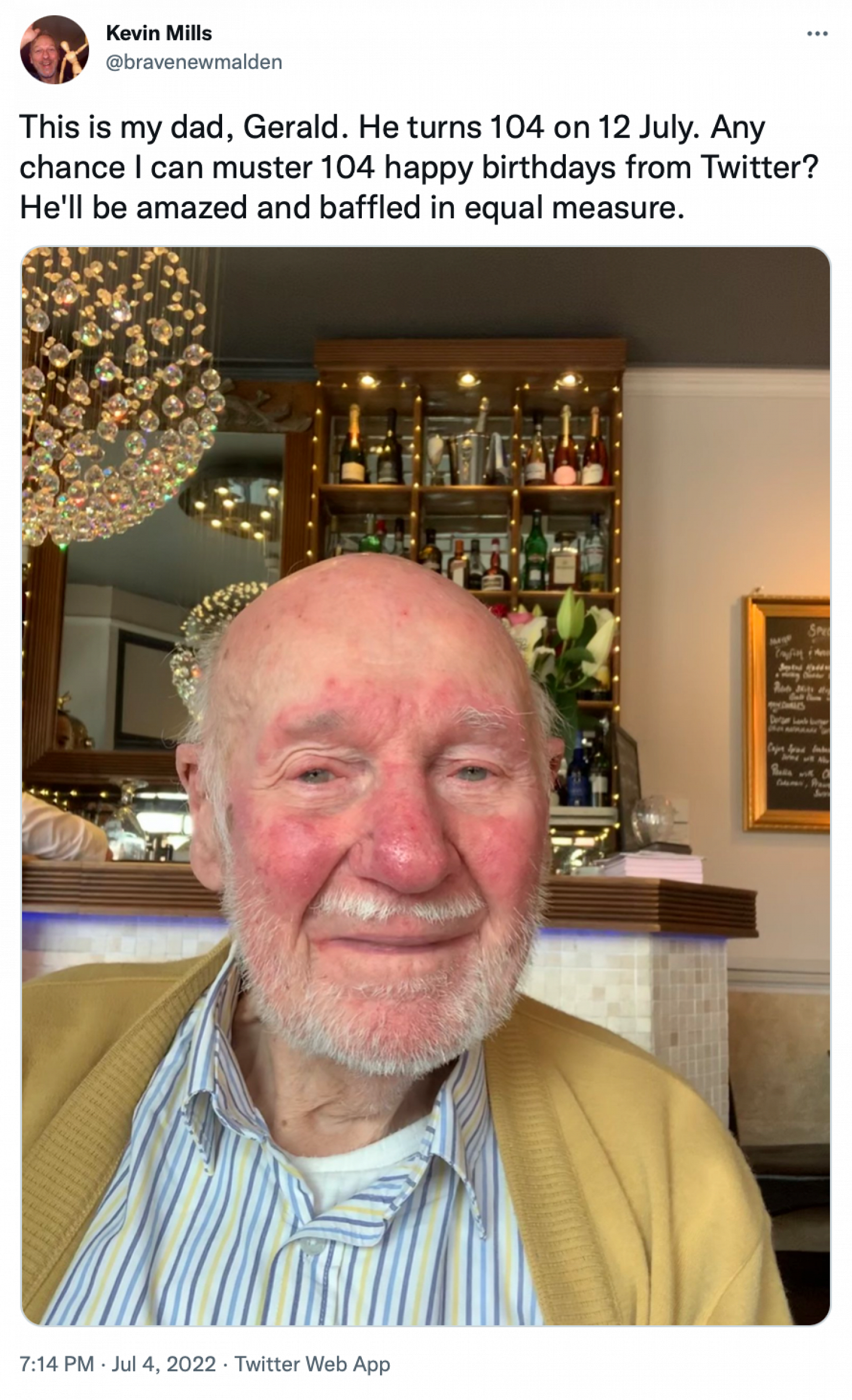Перейти столетний рубеж жизни удается не такому большому количеству людей, и истории долгожителей обычно вызывают интерес и особый трепет. 104 года — пусть не юбилейная, но впечатляющая дата, и Кевин Миллс решил поздравить с ней своего отца необычным образом. За неделю до события он опубликовал в своем твиттере пост, в котором обратился к аудитории с просьбой помочь собрать 104 поздравления.
