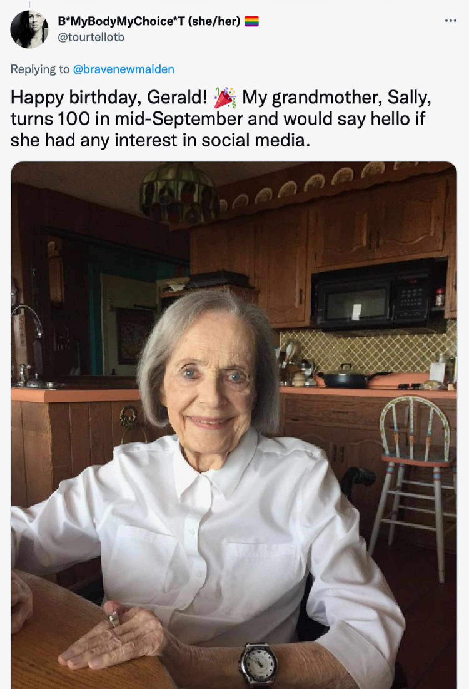 «С днем рождения, Джеральд! Моей бабушке Салли в середине сентября исполняется 100 лет, и она поздоровалась бы, если бы у нее был хоть какой‑то интерес к социальным сетям»
