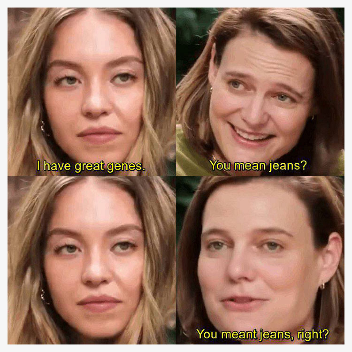 Актриса Сидни Суини стала героиней мемов после интервью GQ. Она холодно и невозмутимо прокомментировала скандал вокруг рекламы, в которой усмотрели расистский подтекст. Летом 2025 года бренд American Eagle запустил кампанию со слоганом «Sydney Sweeney has great jeans» («У Сидни Суини отличные джинсы»). В этой фразе можно усмотреть игру слов, основанную на созвучии английских слов jeans («джинсы») и genes («гены»). Ситуацию усугубило и то, что позвали сниматься в рекламе именно Суини — светловолосую голубоглазую девушку.
