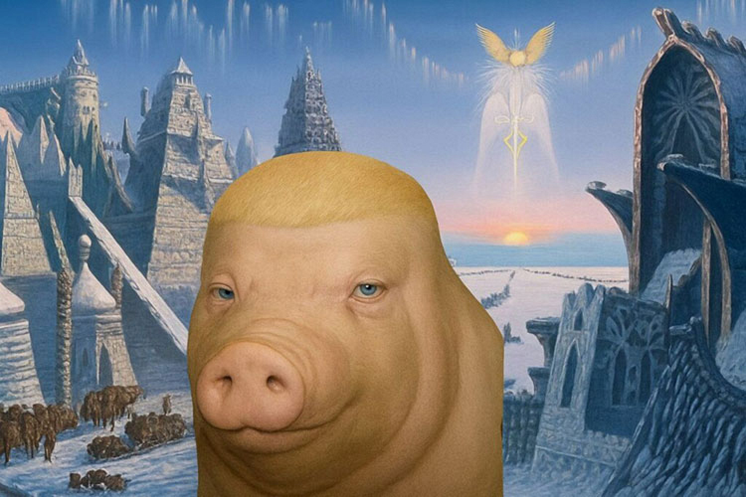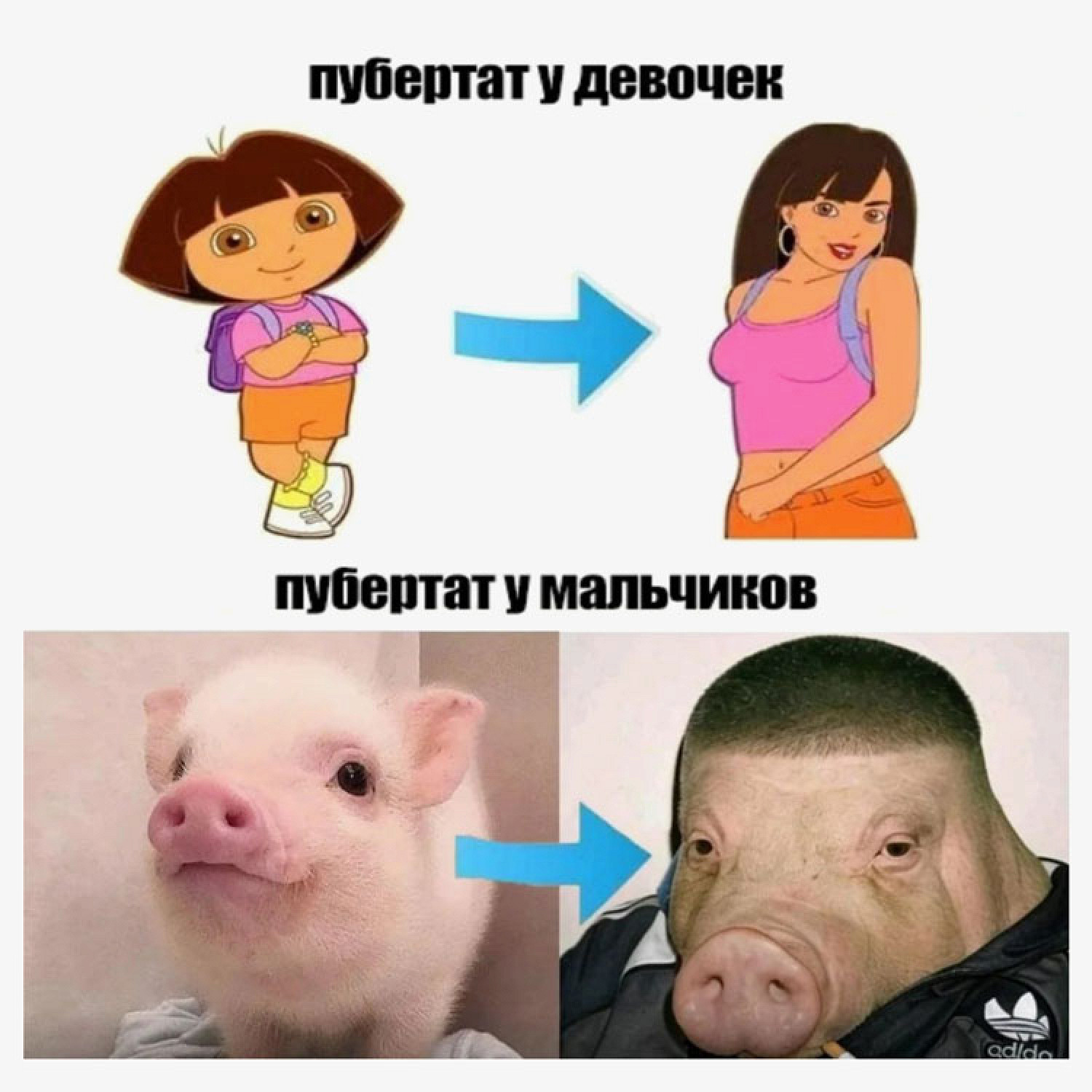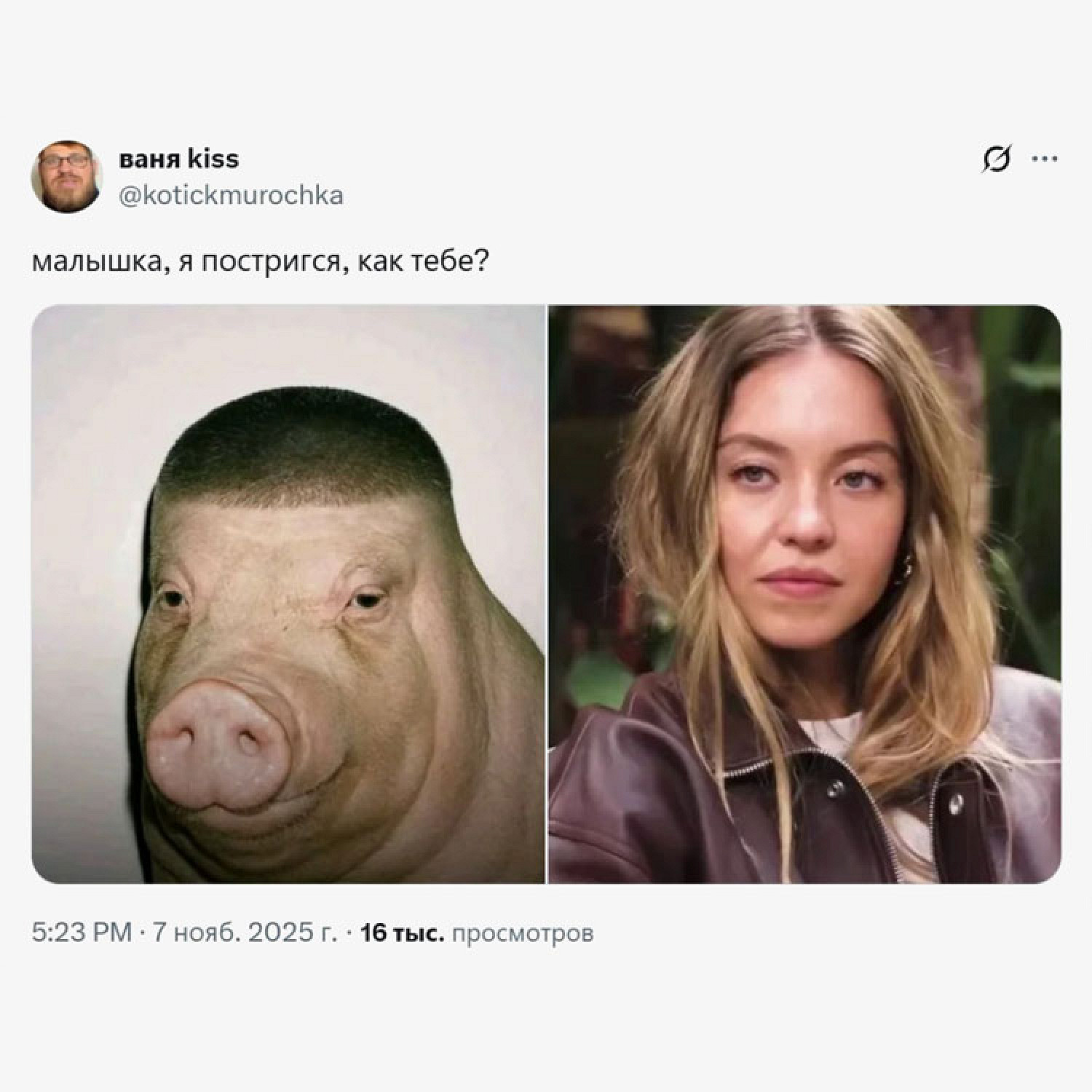 Со временем пользователи стали добавлять свину разные аксессуары, макияж и мемные подписи. Особенную популярность в России получил коллаж свина и актрисы Сидни Суини — именно так, по версии интернета, выглядит стереотипная восточноевропейская пара.