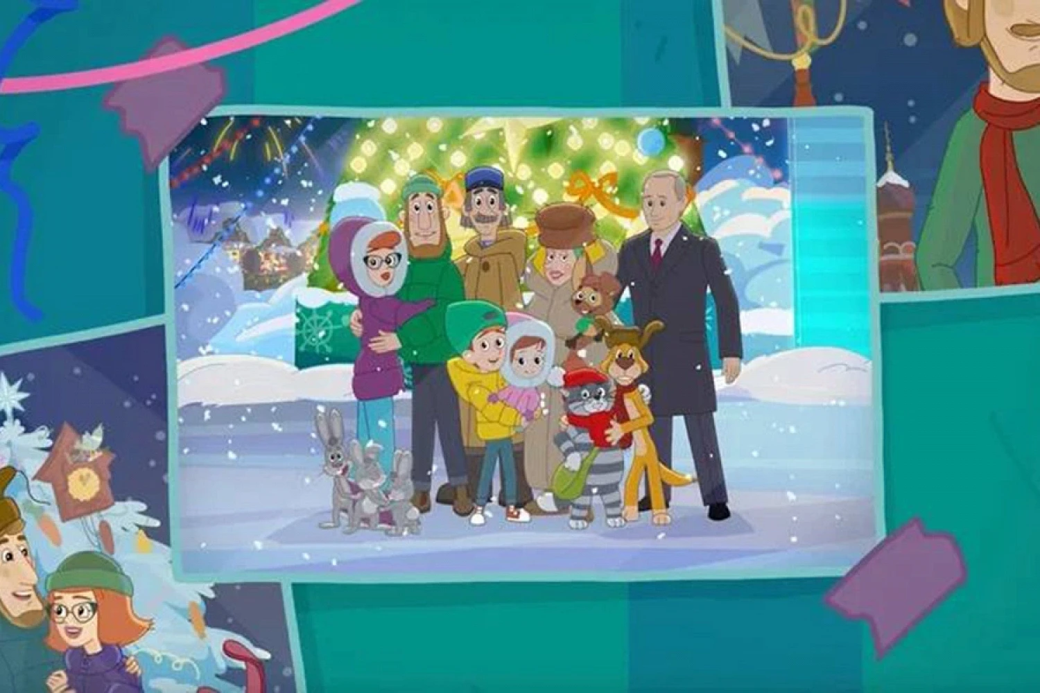 На изображении Путина окружают все ключевые герои мультфильма: дядя Федор, его родители, кот Матроскин, Шарик, почтальон Печкин и другие. На фоне расположена новогодняя елка. Судя по всему, по сюжету это фотография, прикрепленная на стену или холодильник.