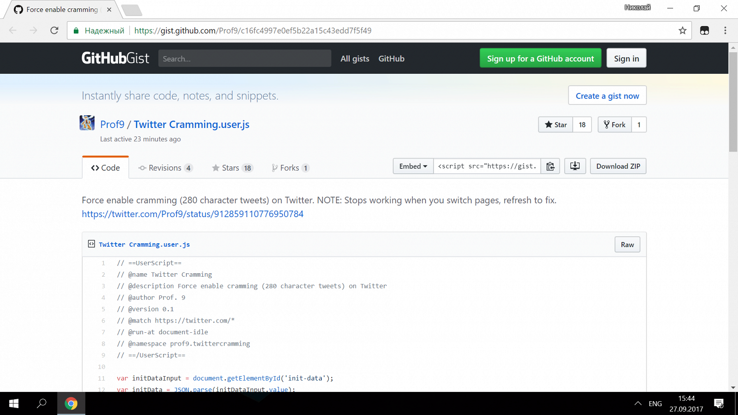 Зайдите в твиттер через Chrome и начните набирать новый твит. Когда скрипт установлен, счетчик символов не работает.