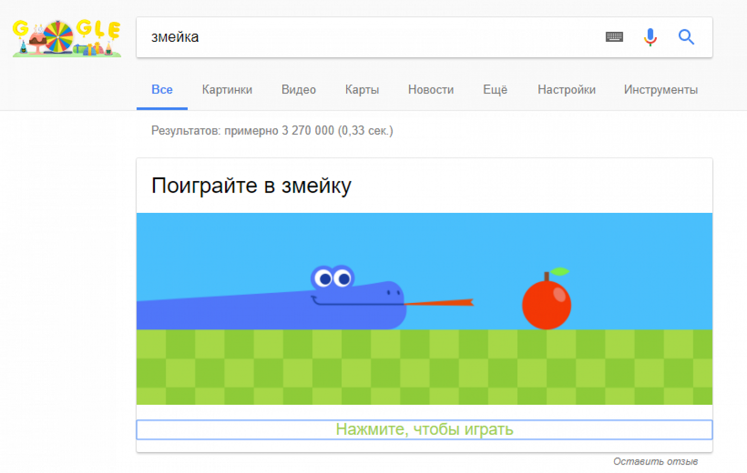 Для того чтобы пасхалка появилась, необходимо ввести в поисковую строку запрос: «Змейка» или Snake. Игра доступна не только в веб-версии, но и с мобильных устройств.
