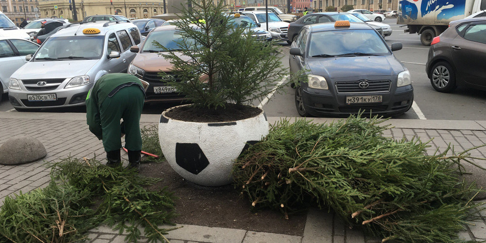 В первую очередь петербургские коммунальщики принялись за клумбы на площади Восстания, на которой расположен Московский вокзал. Позже воткнутые в землю еловые ветки появились на Исаакиевской площади, а также на пересечении Невского проспекта и Садовой улицы.