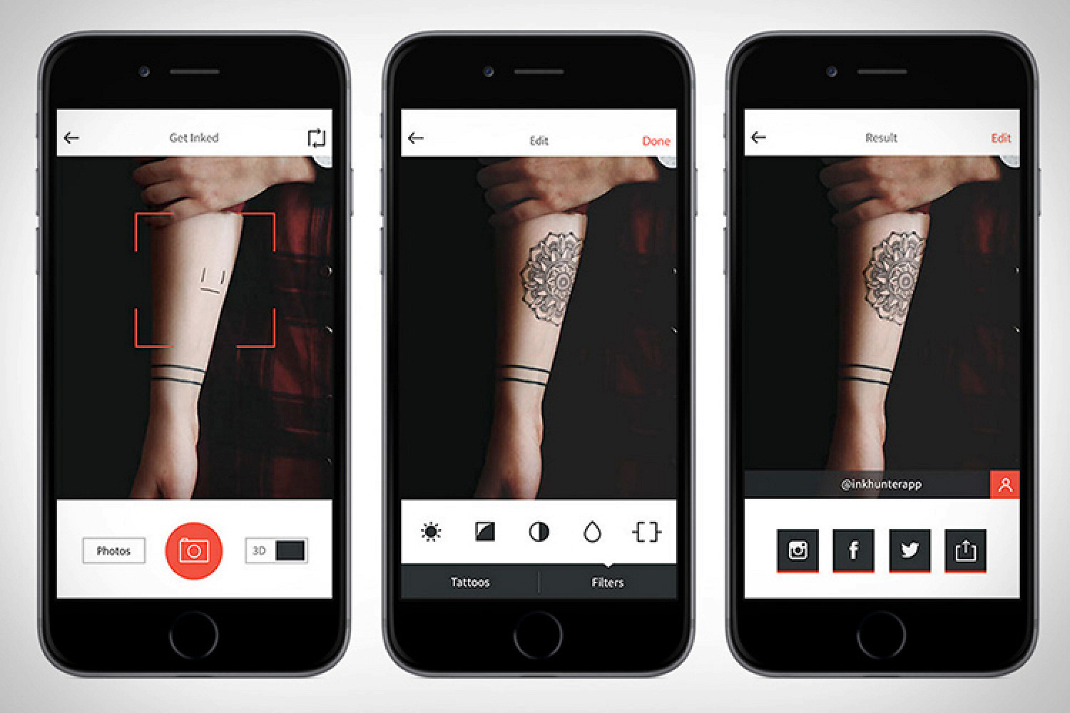 Мобильное приложение InkHunter использует технологии дополненной реальности. Пользователю достаточно нарисовать подобие смайла (три линии) в том месте, где он планирует сделать татуировку, и сфотографировать его на телефон. После того как затвор камеры сработал, на месте рисунка на снимке появляется татуировка, которую можно поворачивать, перемещать и менять в размерах. В приложение уже загружен набор татуировок — впрочем, можно добавлять и собственные эскизы.