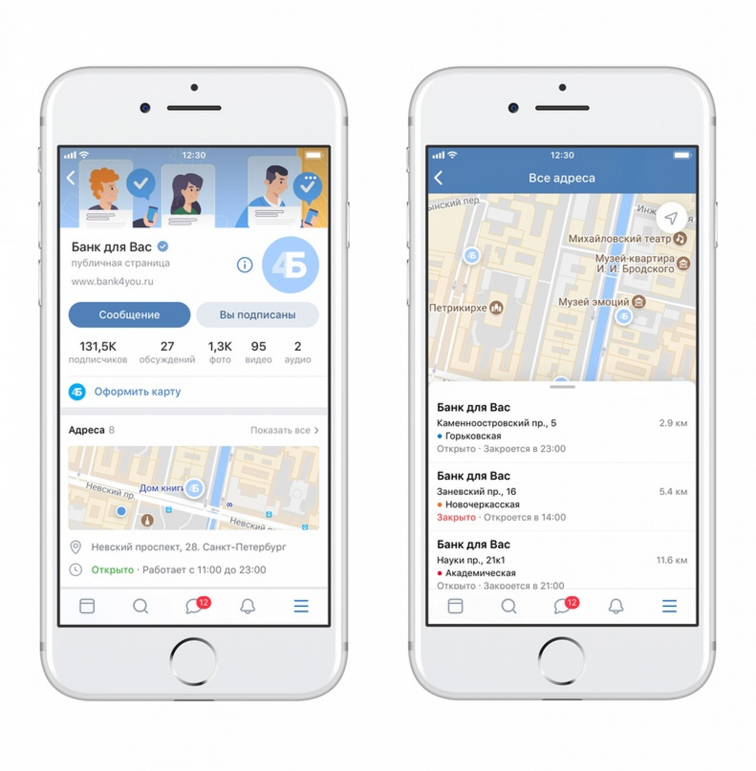 «ВКонтакте» представила новые инструменты для бизнес-сообществ в мобильном приложении. Теперь страницы получили раздел «Адреса», где отображается место расположения заведения и его часы работы. Адреса отсортированы в зависимости от расстояния, до точки можно мгновенно построить маршрут.