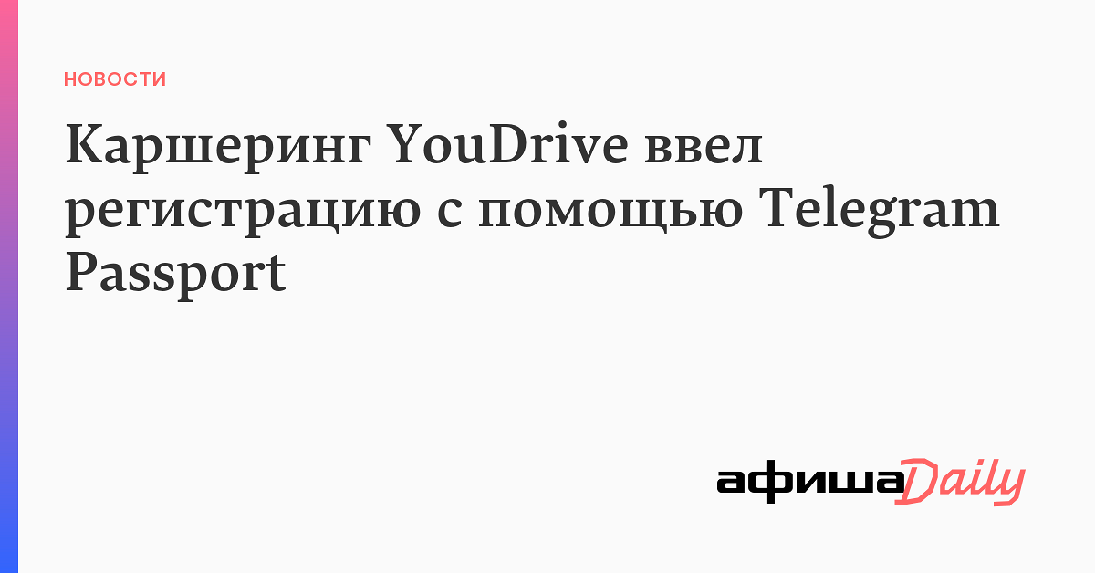 Сервис каршеринга YouDrive начал в тестовом режиме регистрировать пользователей с помощью сервиса хранения документов Telegram Passport, запущенного месяц назад. Об этом сообщает портал «Трушеринг» со ссылкой на пресс-службу YouDrive.