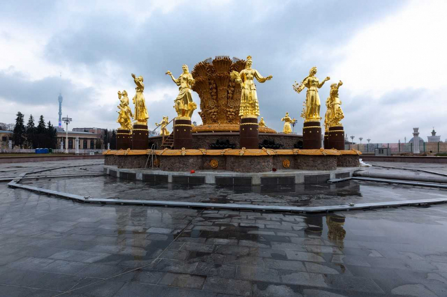 Пока что фонтан открыт только в тестовом режиме. Его реставрация началась в октябре 2018 года, рабочие и реставраторы обновили гидротехнические системы фонтана, укрепили каркасы его конструкций, а также восстановили скульптуры 16 золотых женских фигур, олицетворяющих республики Советского Союза.