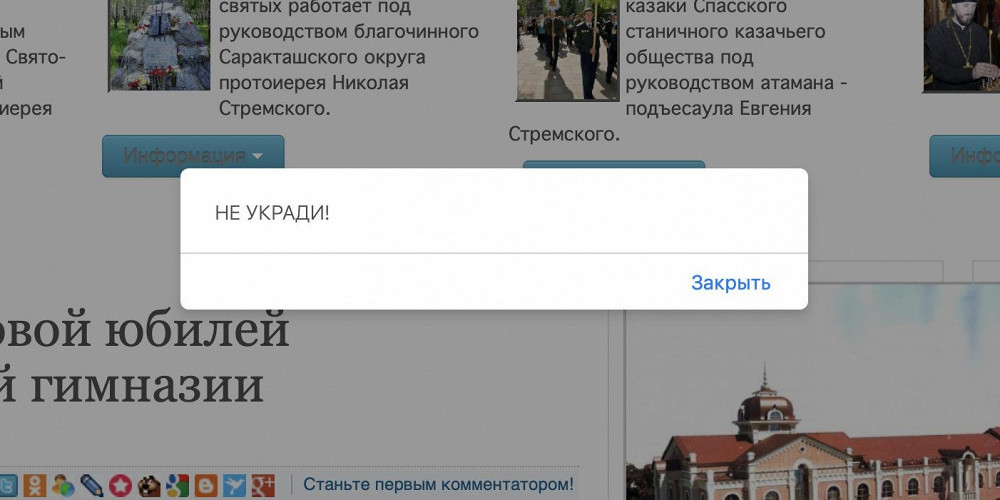 Администрация оренбургского сайта «Православный духовный вестник Саракташского благочиния» запретила копировать тексты и картинки. При клике правой кнопкой мыши на любой его странице в браузере всплывает окно «Не укради!», при этом сделать ничего нельзя, обратили внимание пользователи соцсетей.