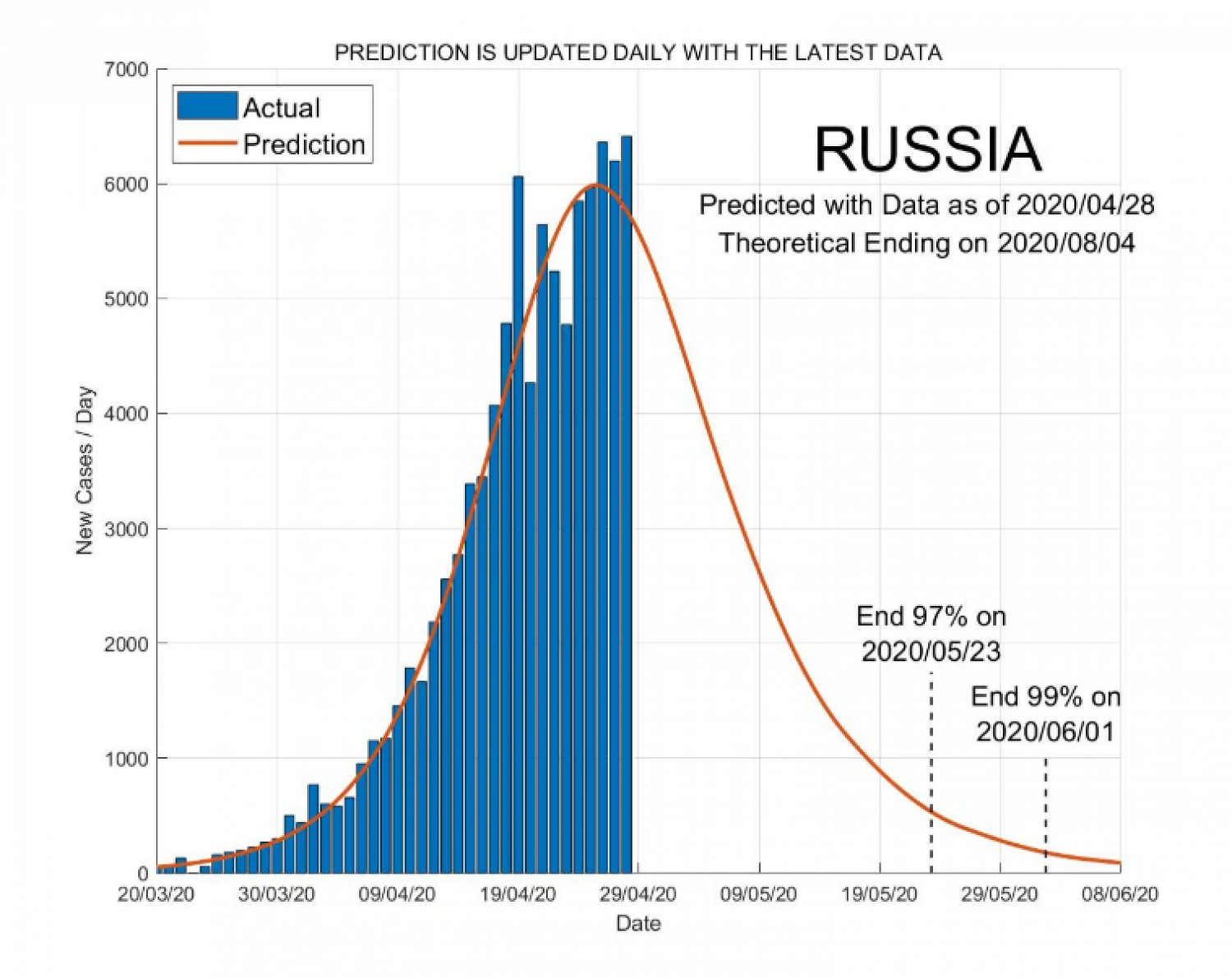 Например, в России, по данным сайта, с вероятностью 97% эпидемия закончится 23 мая, с вероятностью 100% — примерно 4 августа.
