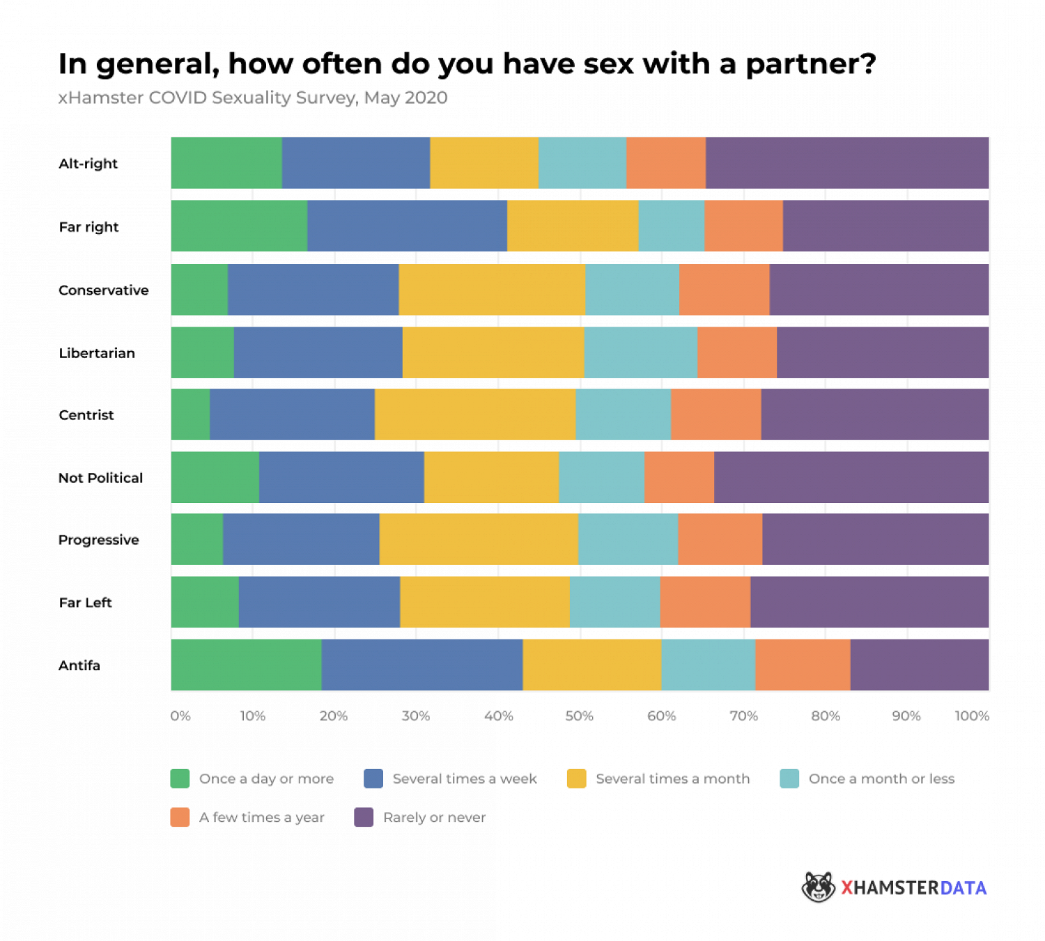 Левые и правые радикалы сражаются за звание самых сексуально активных. 42,8% антифашистов и 41,2% ультраправых заявили, что занимаются сексом с партнером несколько раз в неделю или чаще. Реже всего секс бывает у аполитичных и альтернативных правых.