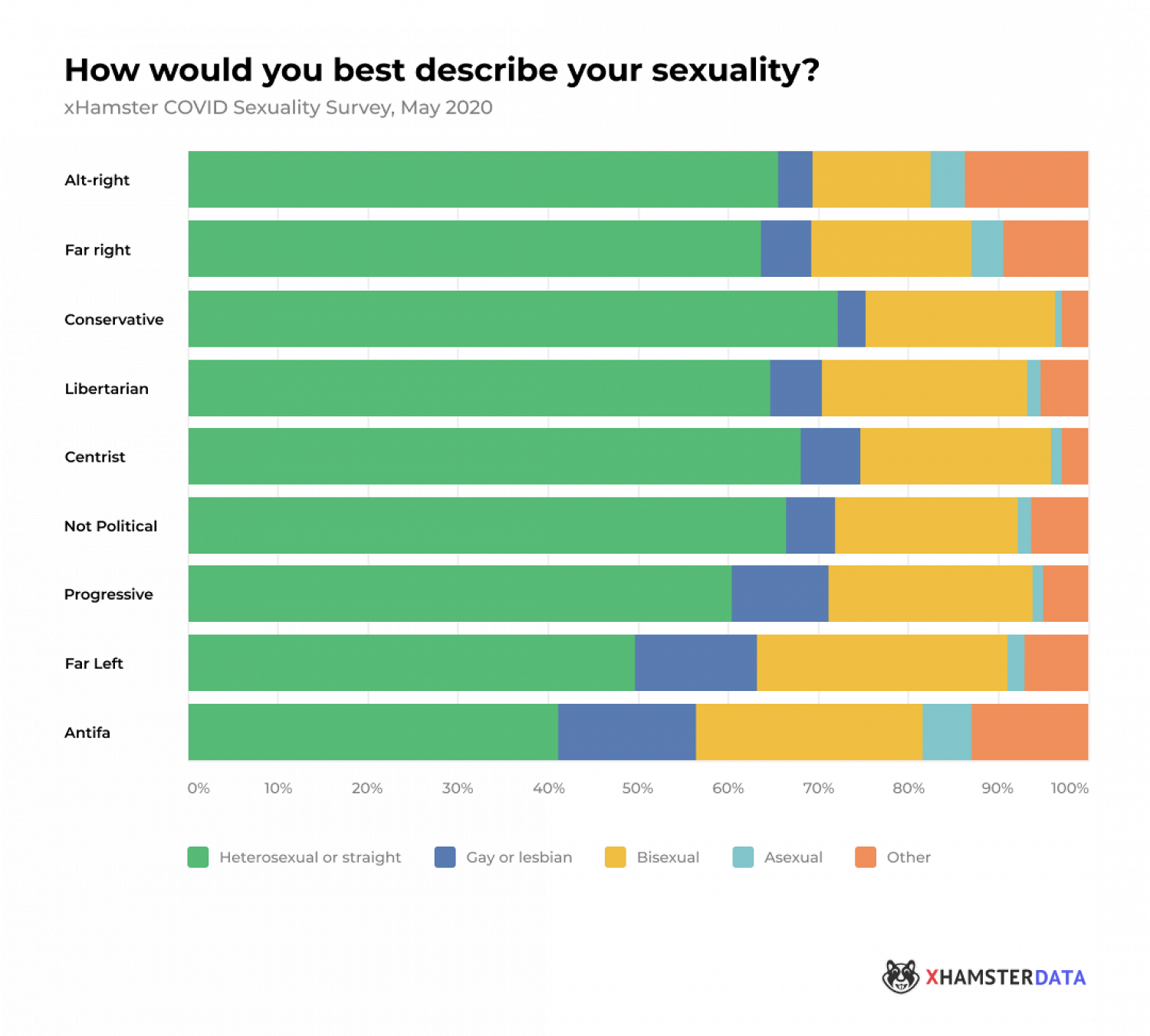 Большинство участников опроса определили свою сексуальную ориентацию как гетеросексуальную. Но среди консерваторов доля гетеросексуалов самая высокая (72,3%), а среди антифашистов и крайне левых самая низкая (40,9% и 49,6% соответственно).