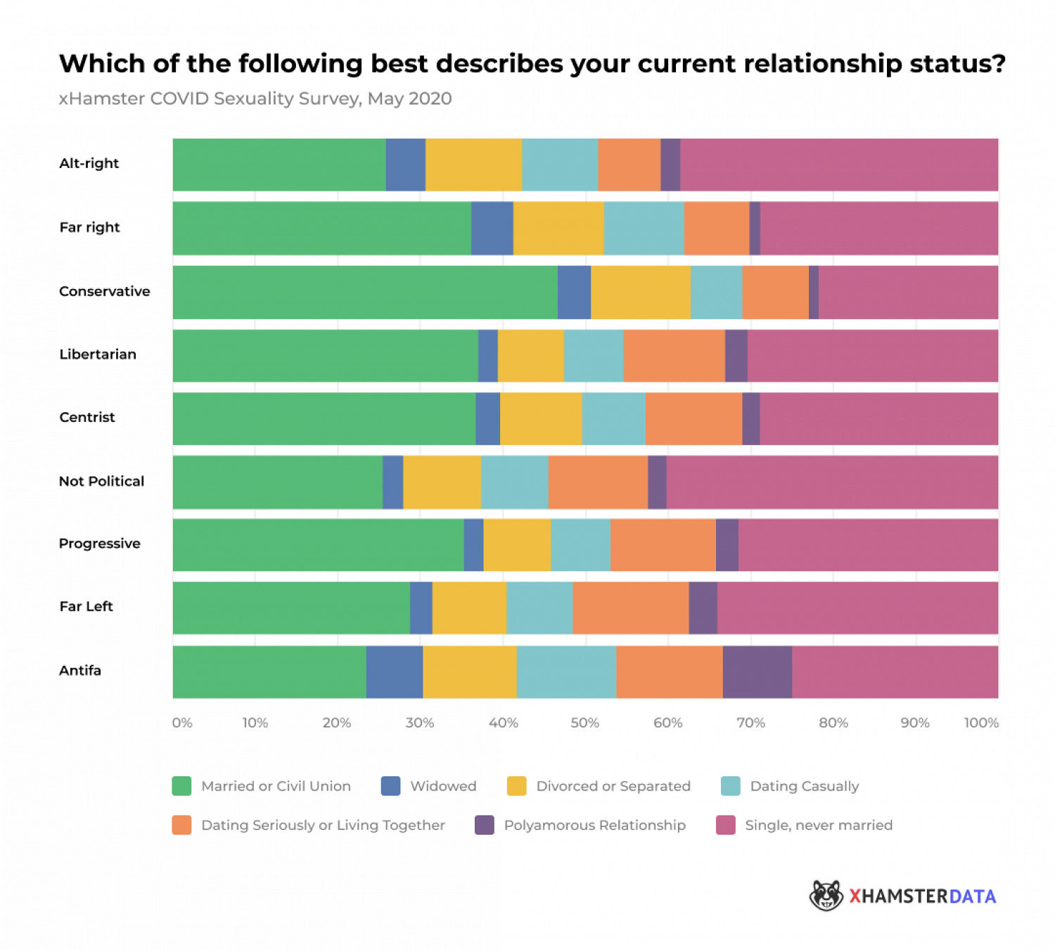 Выяснилось, что в гражданском браке чаще всего состоят консерваторы (46%), а реже всего — антифашисты (24%). Самая большая доля одиночек оказалась среди аполитичных и ультраправых. В свою очередь, антифа и крайне левые чаще описывают свои отношения как полиаморные (8,3% и 3,4% соответственно).