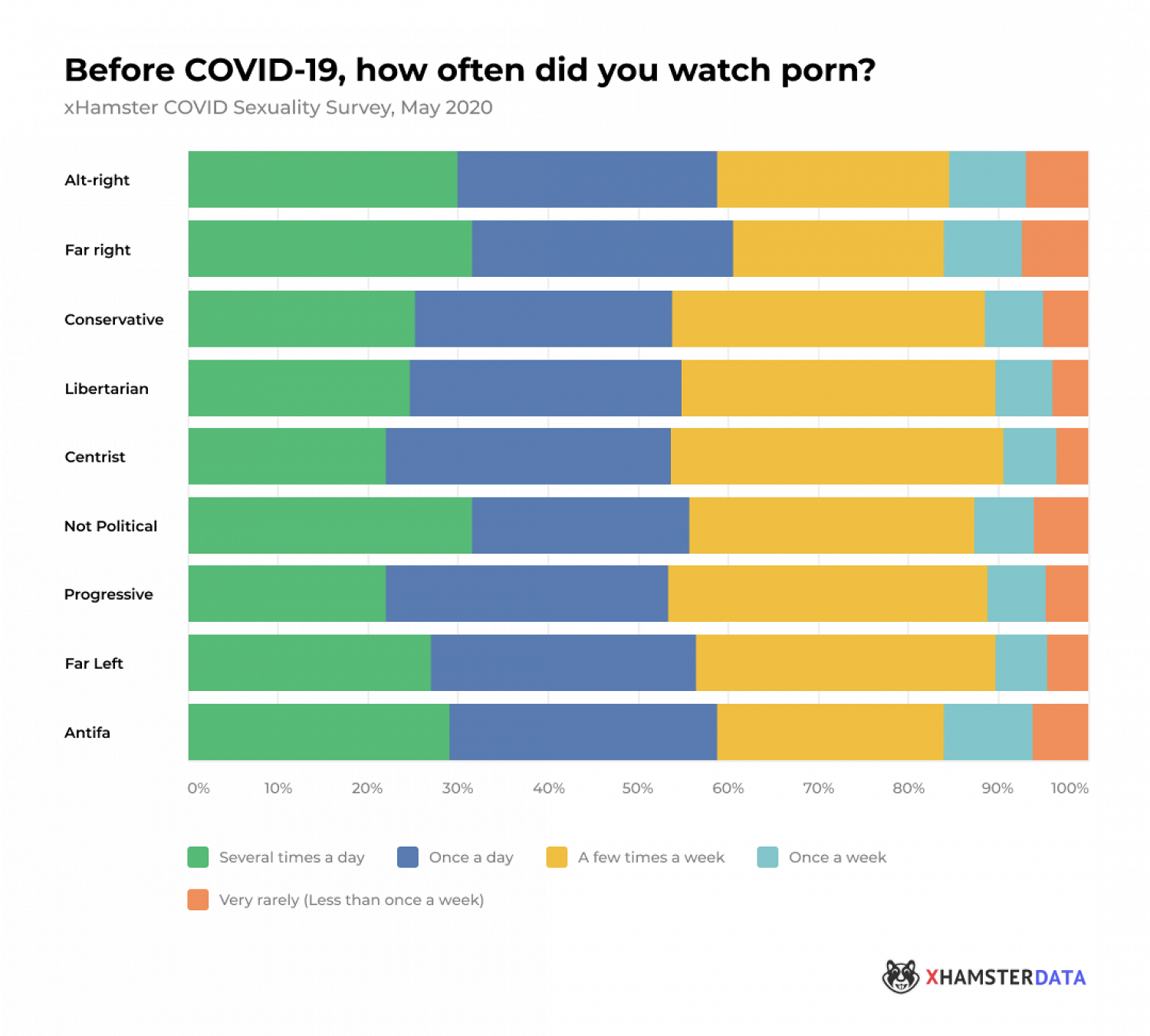 Когда речь заходит о просмотре порно, то на сайты для взрослых чаще всего заходят альтернативные правые (60,7% из них говорят, что делают это раз в день или чаще), крайне правые (58,8%) и антифа (58,3%).