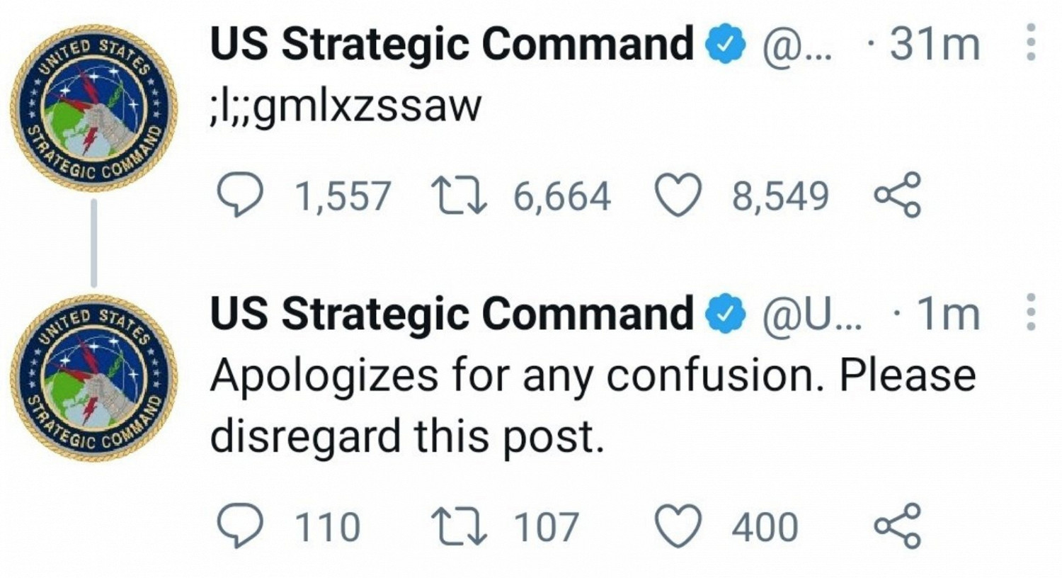 В твиттере стратегического командования США, которое объединяет ядерные силы, силы ПРО и космические войска, появился странный текст «;l;gmlxzssaw.». В скором времени он был удален, а ведомство извинилось и попросило не обращать на него внимания, однако пост заметили пользователи и СМИ.