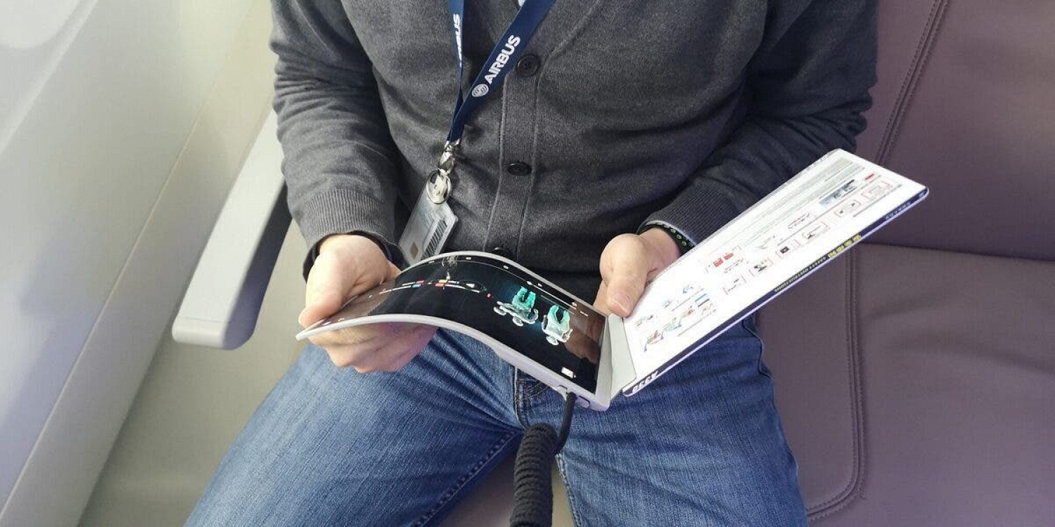 Авиакомпания Airbus показала концепт журнала с гибким OLED-дисплеем для самолетов. Помимо алгоритма действий в критических ситуациях пассажиры смогут смотреть фильмы и заказывать еду, пишет Simple Flying.