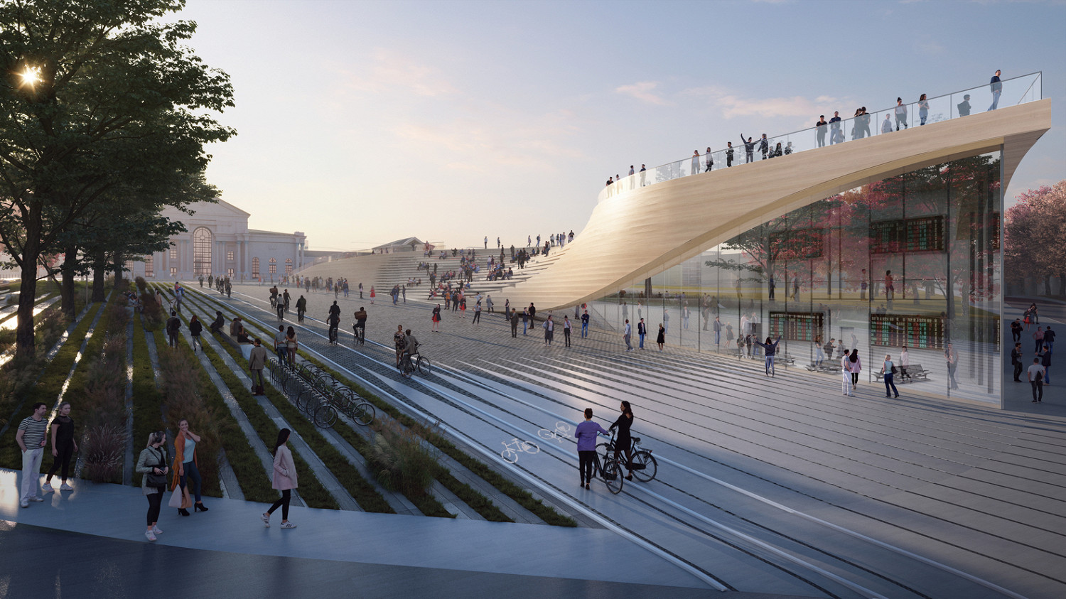 При благоустройстве прилегающей территории приоритет отдадут пешеходам и велосипедистам. Автостоянку на привокзальной площади уберут под землю, а рядом разобьют парк площадью 4000 квадратных метров и высадят 300 новых деревьев.