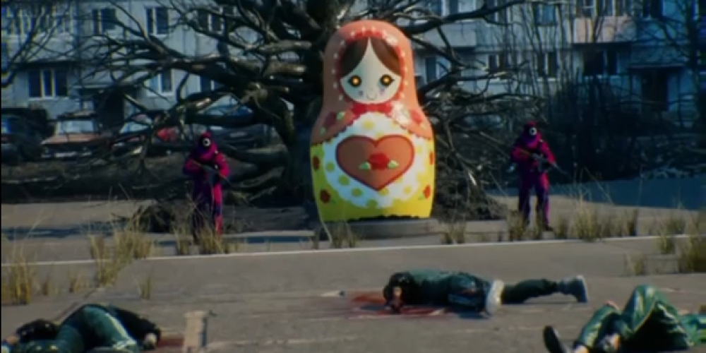 Роль куклы в ролике взяла на себя огромная матрешка с горящими глазами. А место действия перенесено в типичный российский спальный район с панельными многоэтажками.