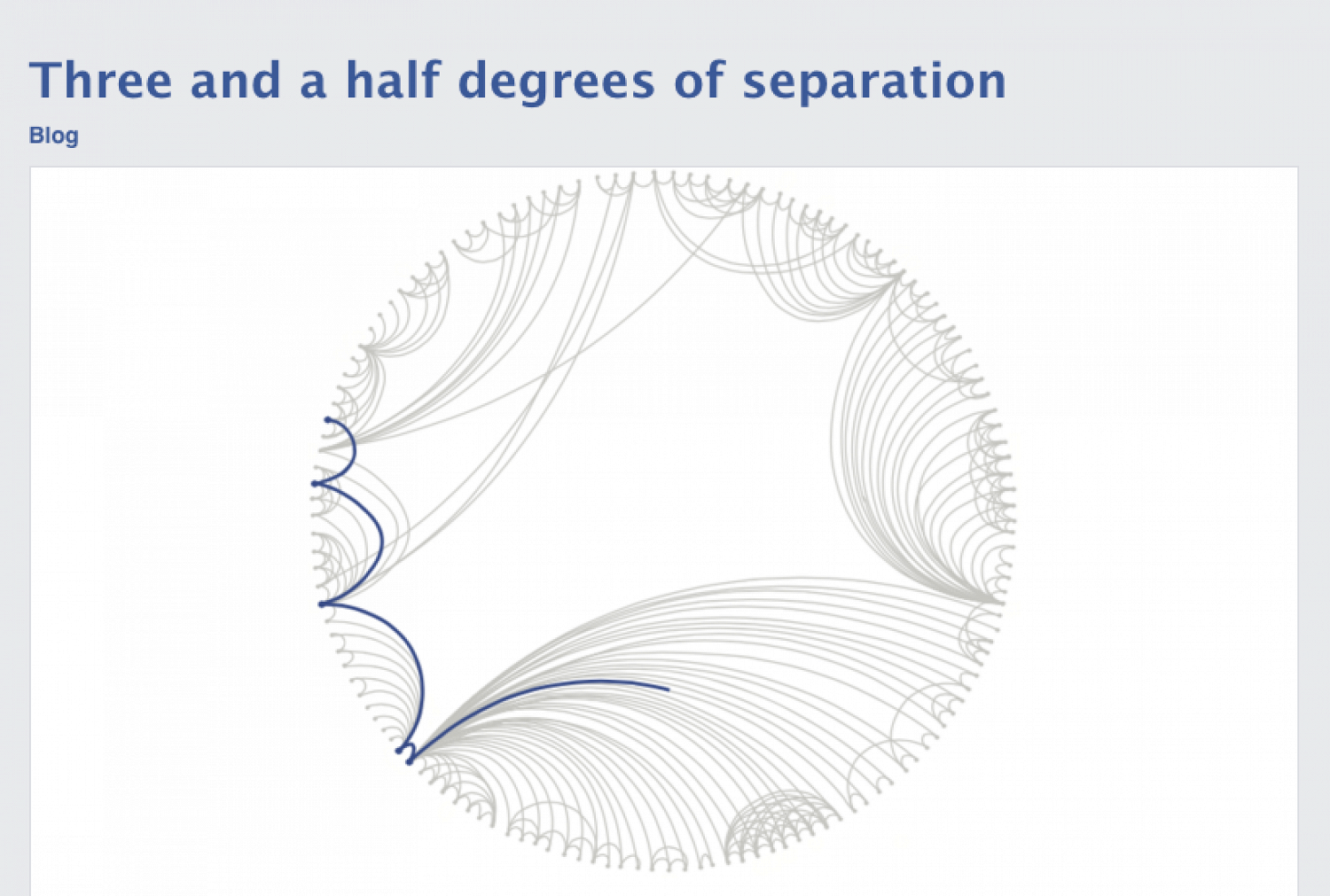 Результаты статистического исследования, опубликованные в официальном блоге Facebook показывают, что сегодня двух пользователей соцсети разделяют в среднем 3,57 «рукопожатия», или уровня связей. Специалисты получили эти данные, проанализировав миллиарды связей между зарегистрированными пользователями фейсбука, число которых составляет 1,6 миллиарда, то есть около четверти всего населения планеты. Отмечается, что в 2011-м двух человек разделяло в среднем 3,74 «рукопожатия», а в 2008 году этот показатель равнялся 4,28.
