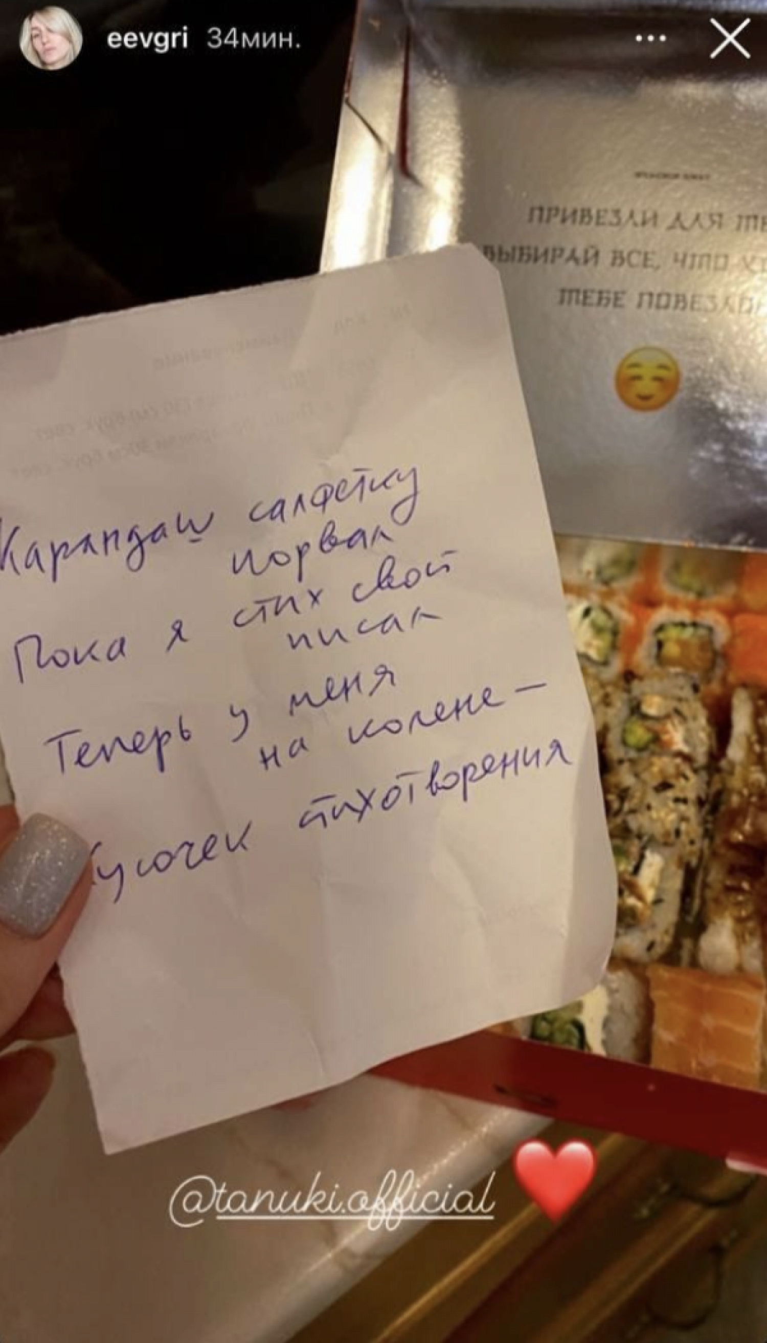 В Москве появился курьер, который доставляет еду и вкладывает стихотворения собственного авторства в заказы. Он сочиняет их прямо на ходу, а затем записывает от руки на небольших бумажках.