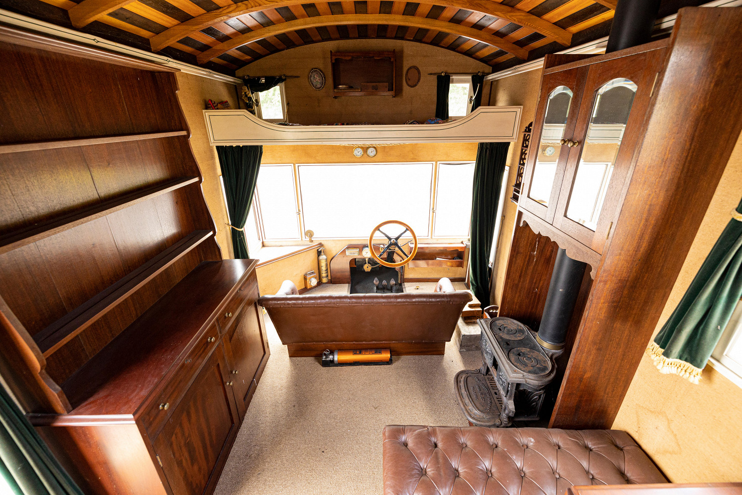 В автомобиле установлены шкафы для хранения вещей. В салоне можно увидеть пол из полированной сосны. Окна автодома украшены зелеными бархатными шторами. Дом на колесах выполнен по заказу, его первыми владельцами была семья Бенталл.