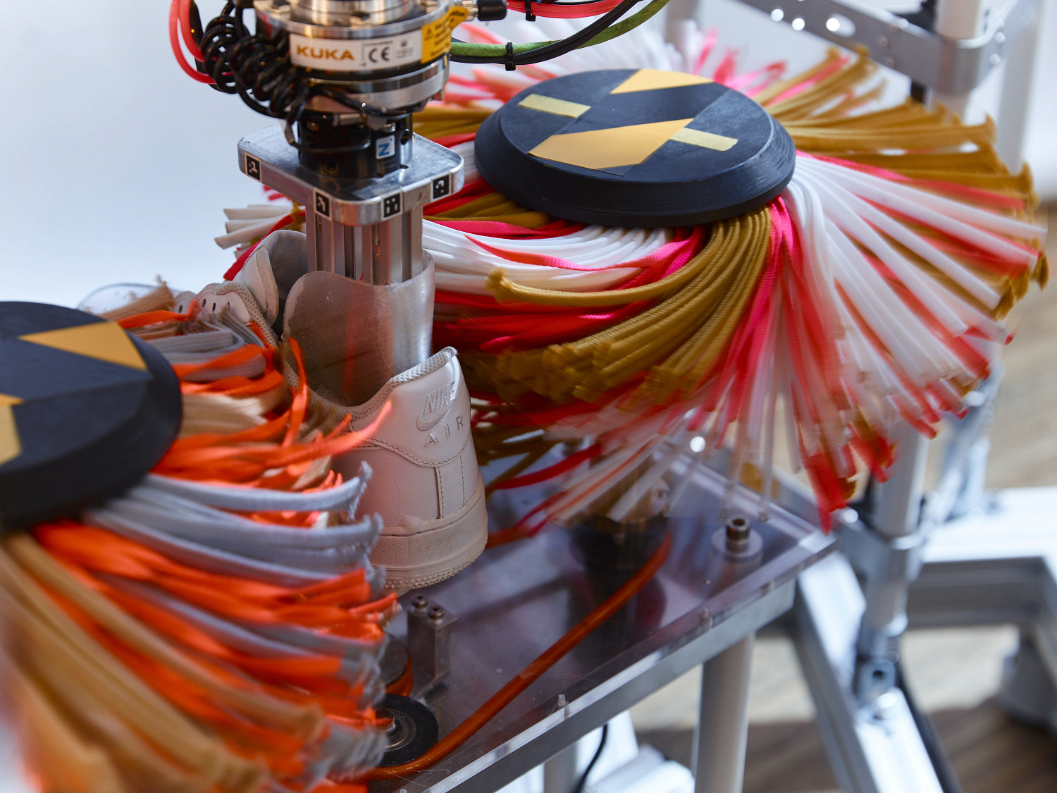 Это работает так: робот создает трехмерную цифровую модель обуви и находит места для чистки сверху, по бокам и на подошве, а владельцы кроссовок в это время могут выбрать заплатки, которые скроют потертости на кроссовках. После того, как BILL закончит работу (чтобы обработать пару Air Force 1, роботу нужно примерно 45 минут), сотрудники установят новые стельки и шнурки из переработанных материалов.