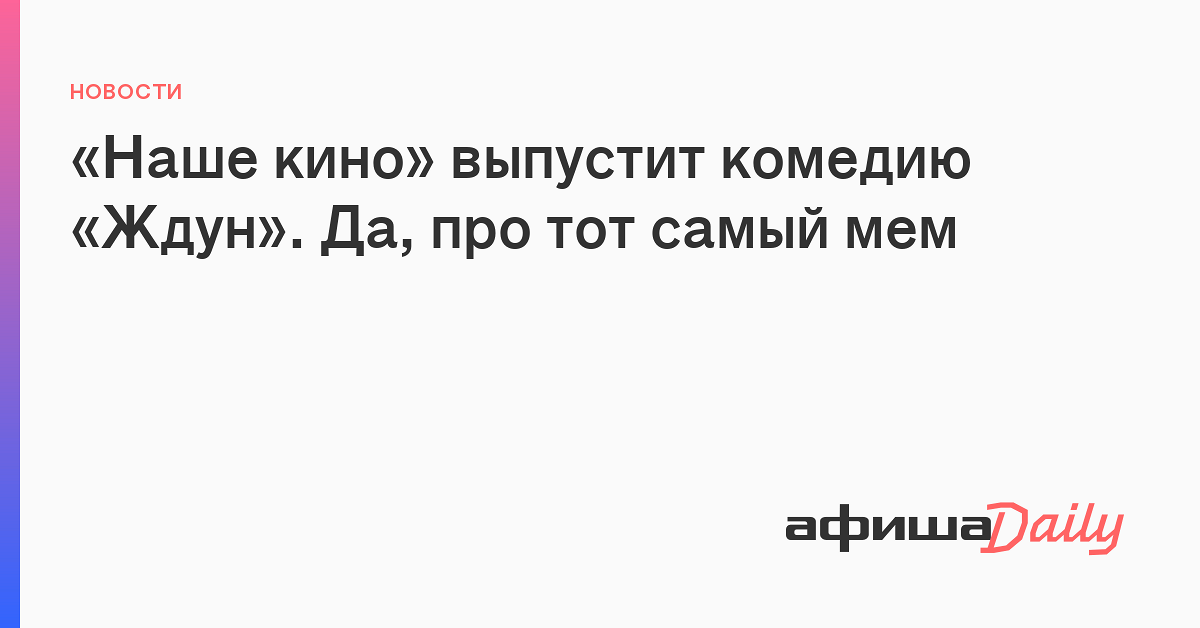 Кинокомпания «Наше кино» разрабатывает полнометражную семейную комедию под рабочим названием «Ждун». Одним из персонажей будет анимированный Ждун, который появился в мае 2016 года и стал популярным мемом в рунете, рассказала «Афише Daily» пресс-служба студии.