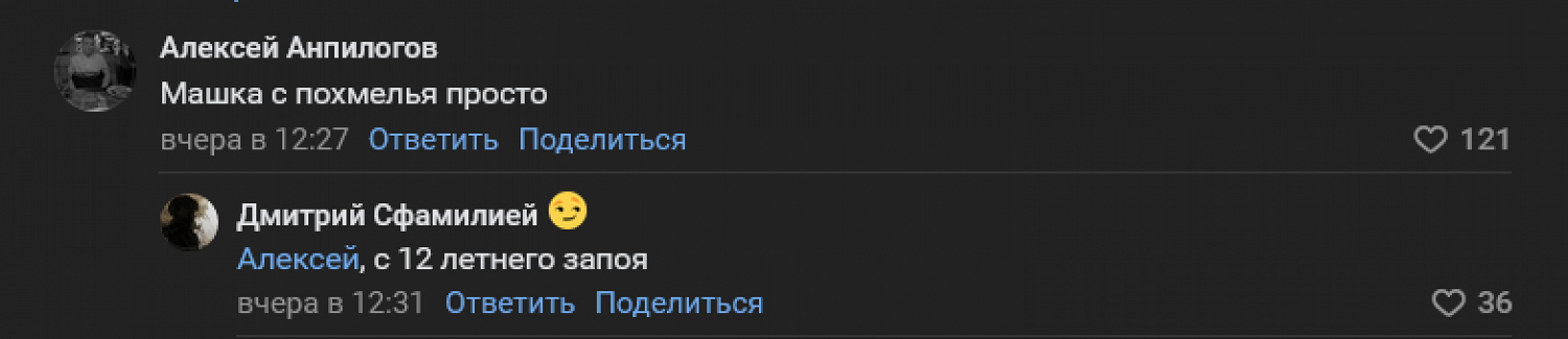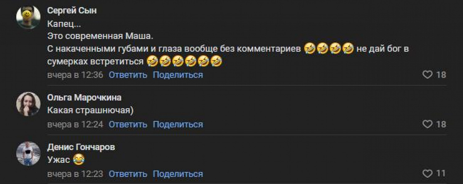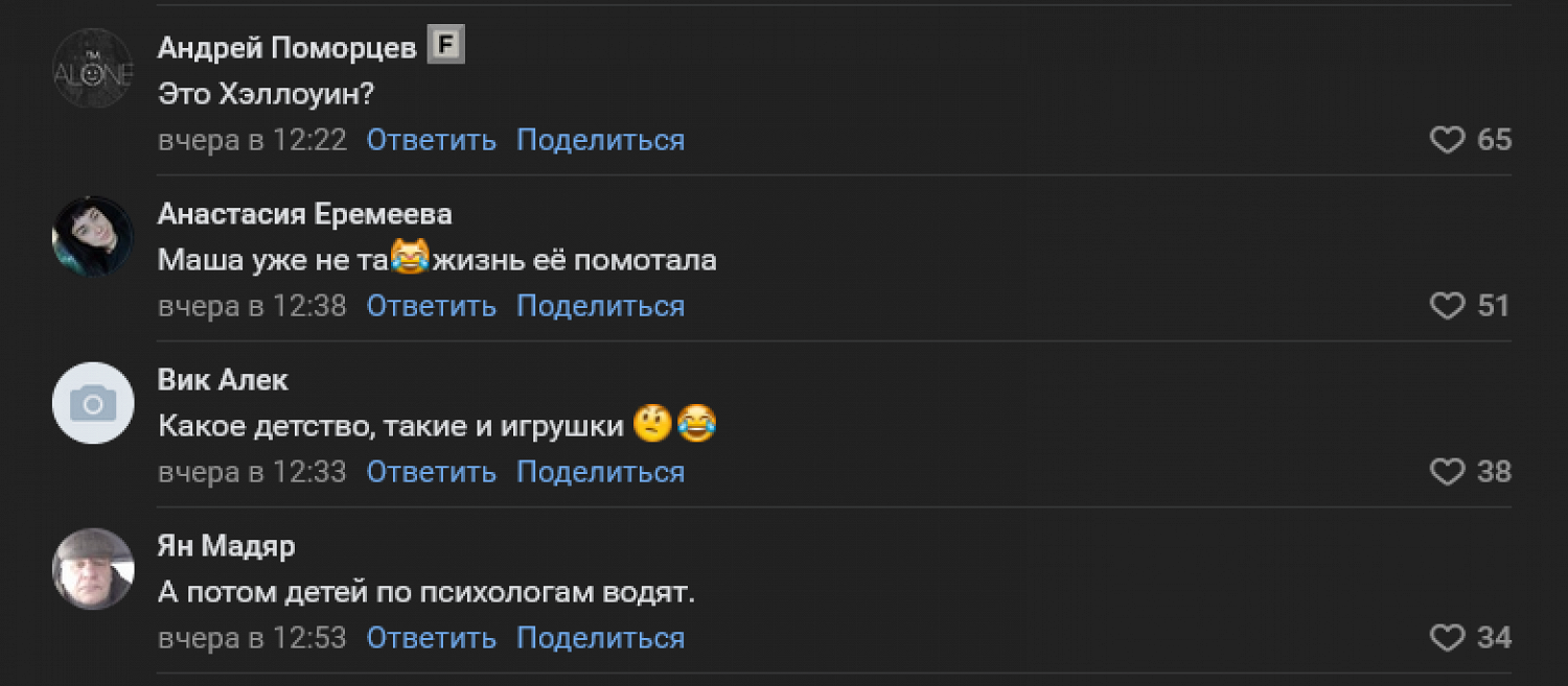 Комментаторы осудили странный внешний вид куклы, которая оказалась не очень похожей на героиню популярного детского мультсериала. У костюма почему‑то были большие красные губы и маленький нос. Зрителям в соцсетях этого хватило, чтобы заподозрить у Маши алкогольную зависимость и заметить, что такой неожиданный наряд мог бы напугать школьников.