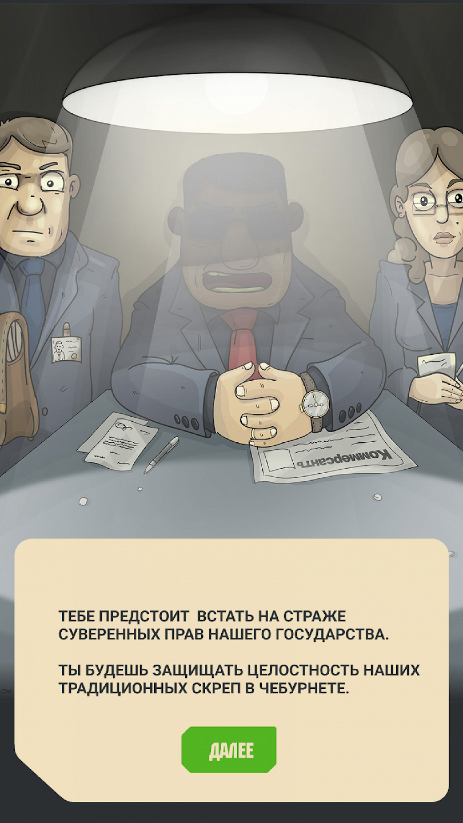 В «Дороге в Чебурнет» играть нужно за сотрудника цензурного ведомства в одном государстве. Разработчики не уточняют его название, но говорят, что оно «очень похоже на одну восточноевропейскую страну».
