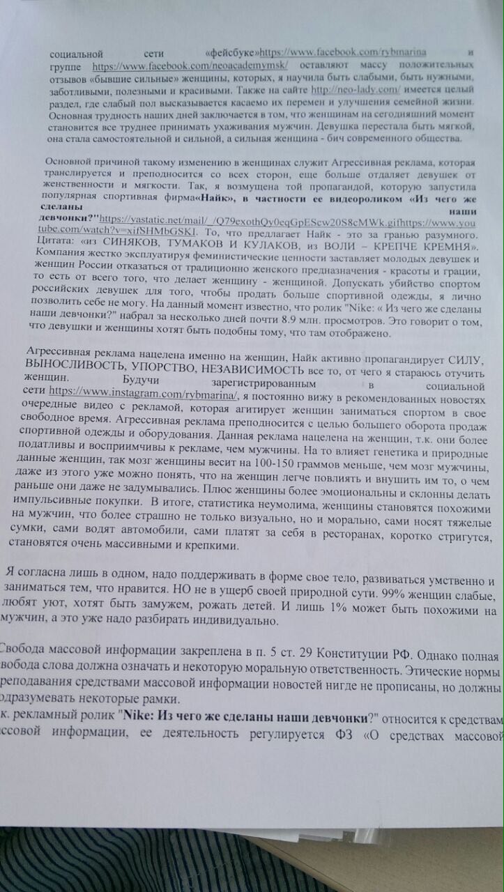 Жительница Москвы Марина Рыбникова подала иск против компании Nike в Кунцевский суд из-за популярного рекламного видеоролика «Из чего же сделаны наши девчонки?» По мнению истца, эта реклама развращает женщин и превращает их в мужчин. Об этом она рассказала корреспонденту «Мосленты».