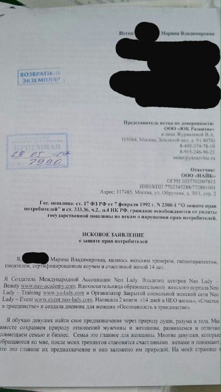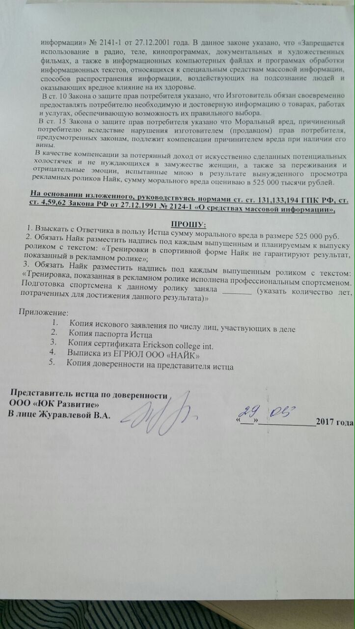 По словам Рыбниковой, она решила подавать иск, после того как получила от клиенток и знакомых множество возмущенных сообщений, а количество просмотров видеоролика превысило девять миллионов. Копия искового заявления имеется в распоряжении «Афиши Daily». Девушка требует взыскать с фирмы 525 тысяч рублей за нанесение морального вреда.