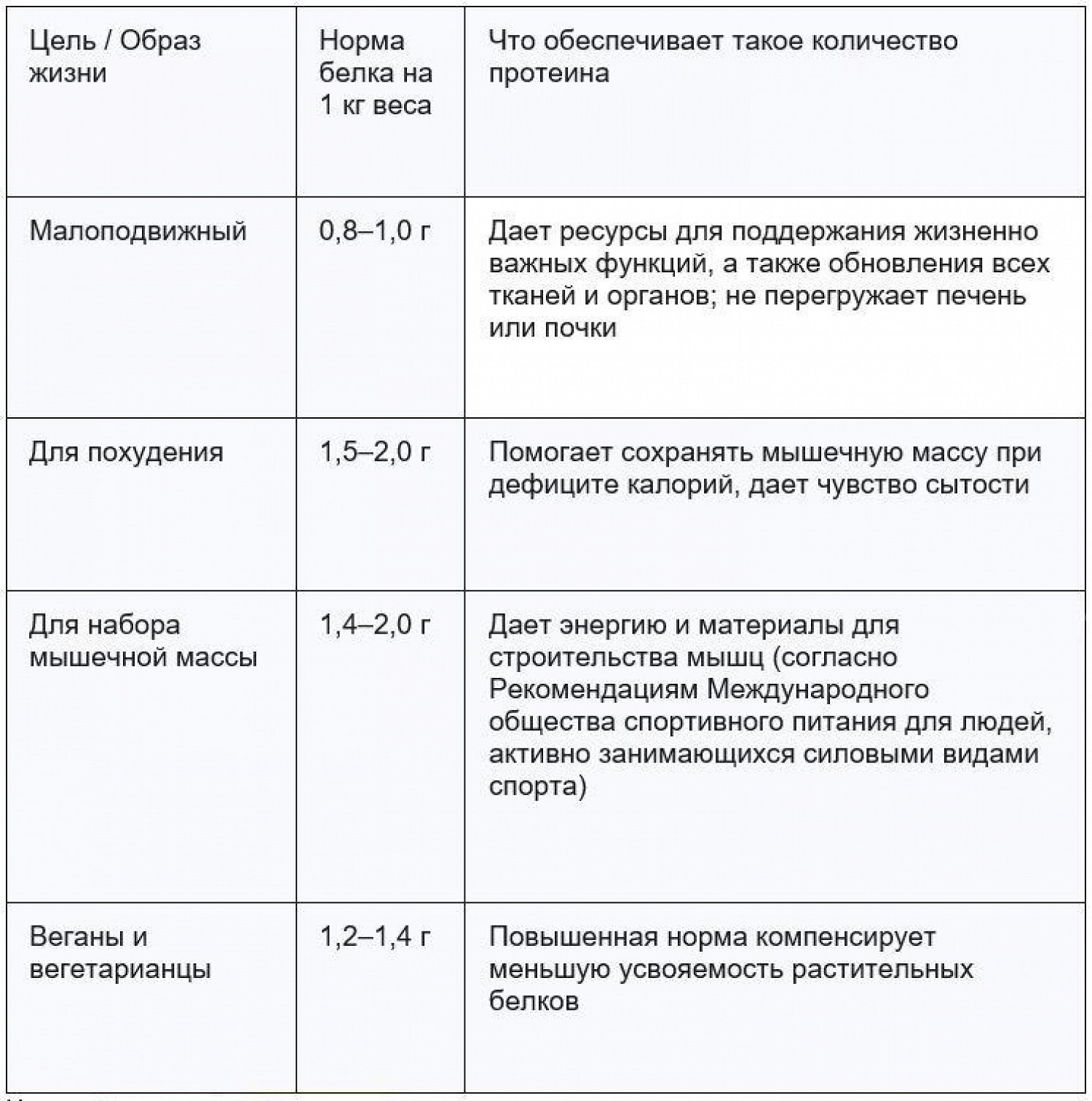 Универсальной нормы не существует, поскольку потребность в протеинах зависит от возраста, пола, образа жизни — даже от текущих целей. Мы объединили показатели, которые рекомендуют нутрициологи для разных жизненных ситуаций, в таблицу, которая поможет вам найти свою норму1—3.