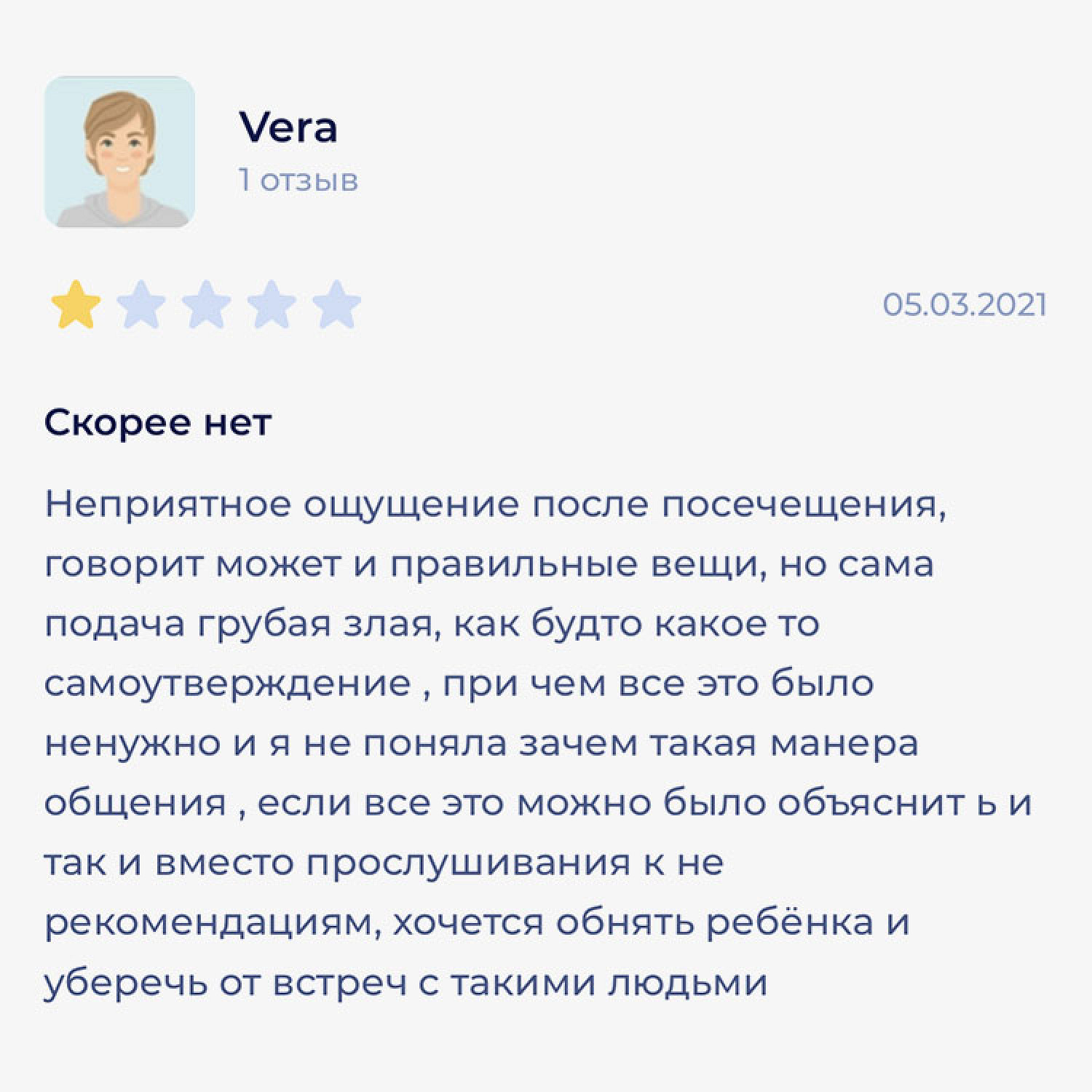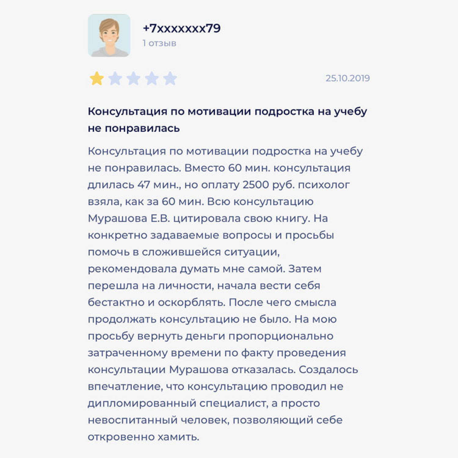 Мурашова ведет прием в государственной детской поликлинике в Санкт-Петербурге, на сайте «НаПоправку» ее рейтинг 3,3 балла. Многие отзывы негативные, с одной звездой.